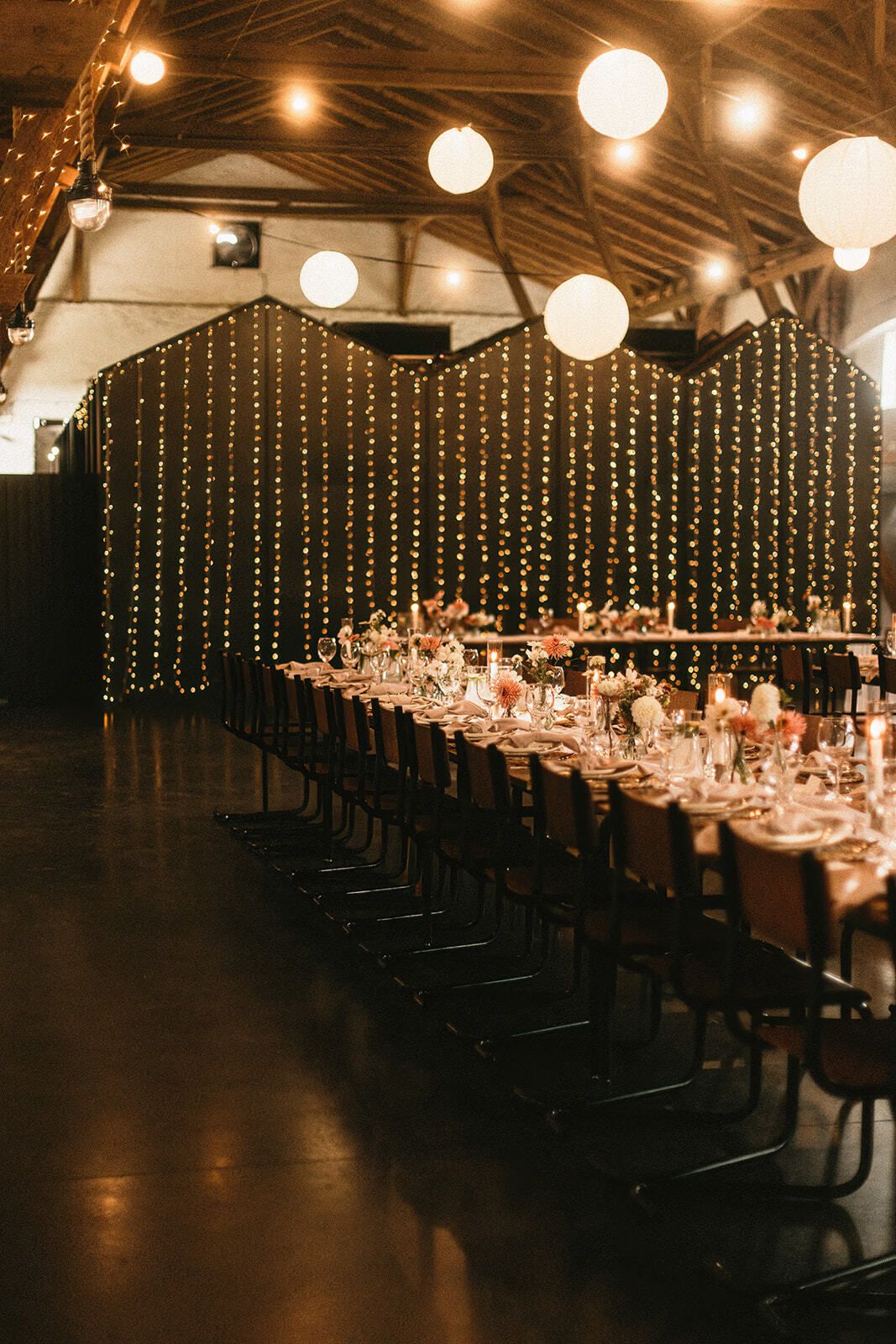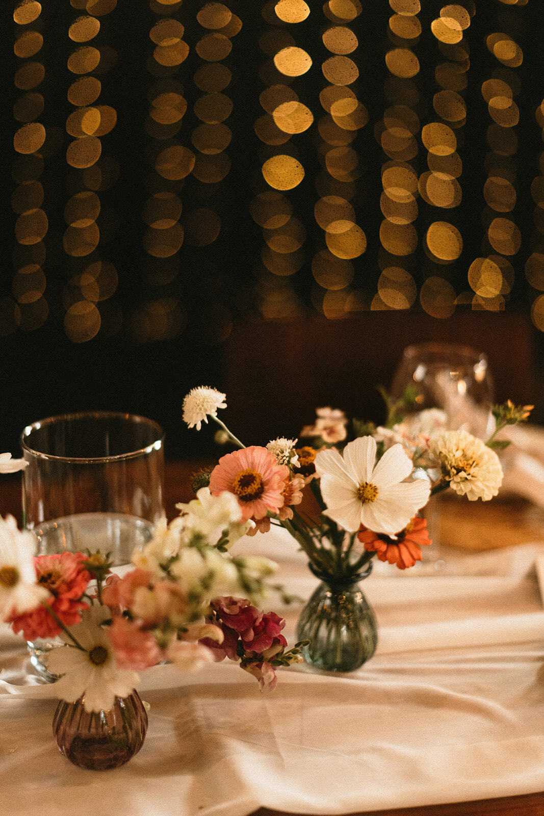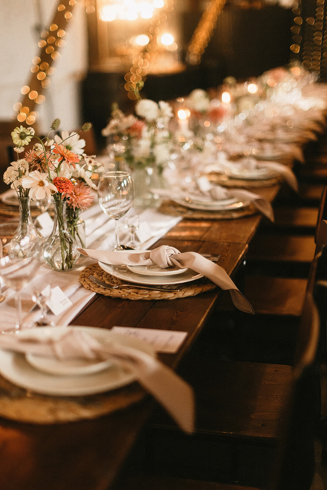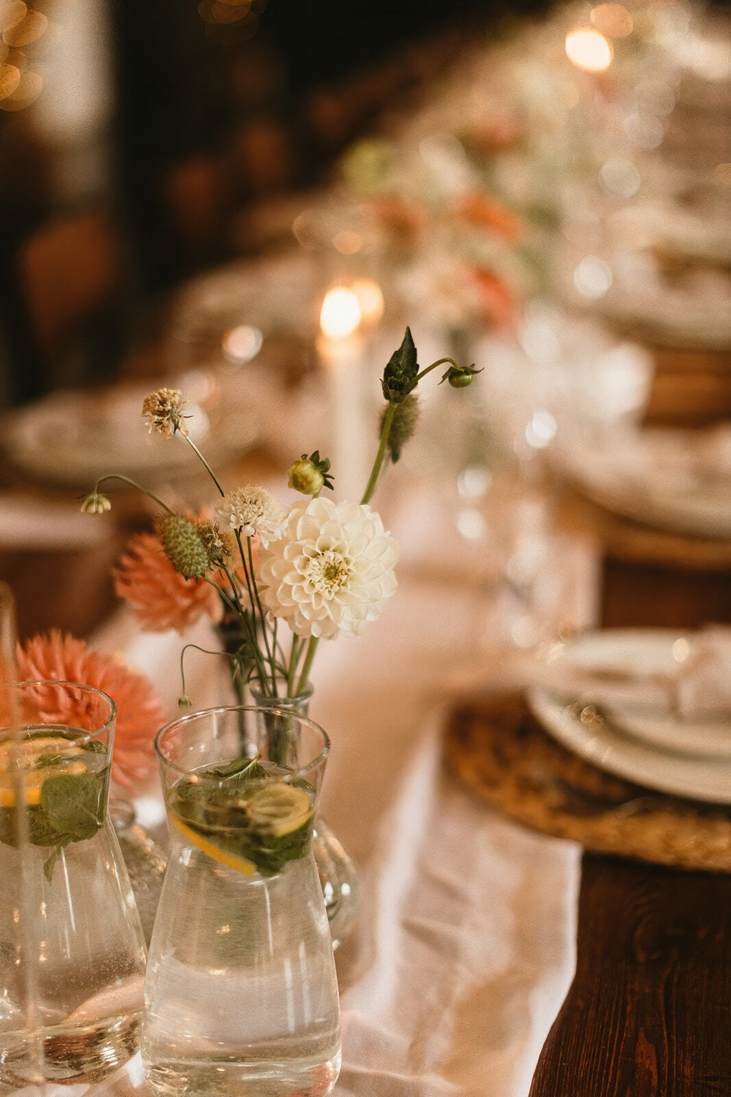 Dobrze znana koncepcja wazoników z lekkimi, zwiewnymi kwiatami w palecie bieli, beżu i odcieniach brzoskwini. Do tego świece w ceramicznych świecznikach z nastawianymi tubami oraz białe, szyfonowe bieżniki. Nic więcej nie potrzeba gdy stoły są tak piękne jak w Ceglarni!