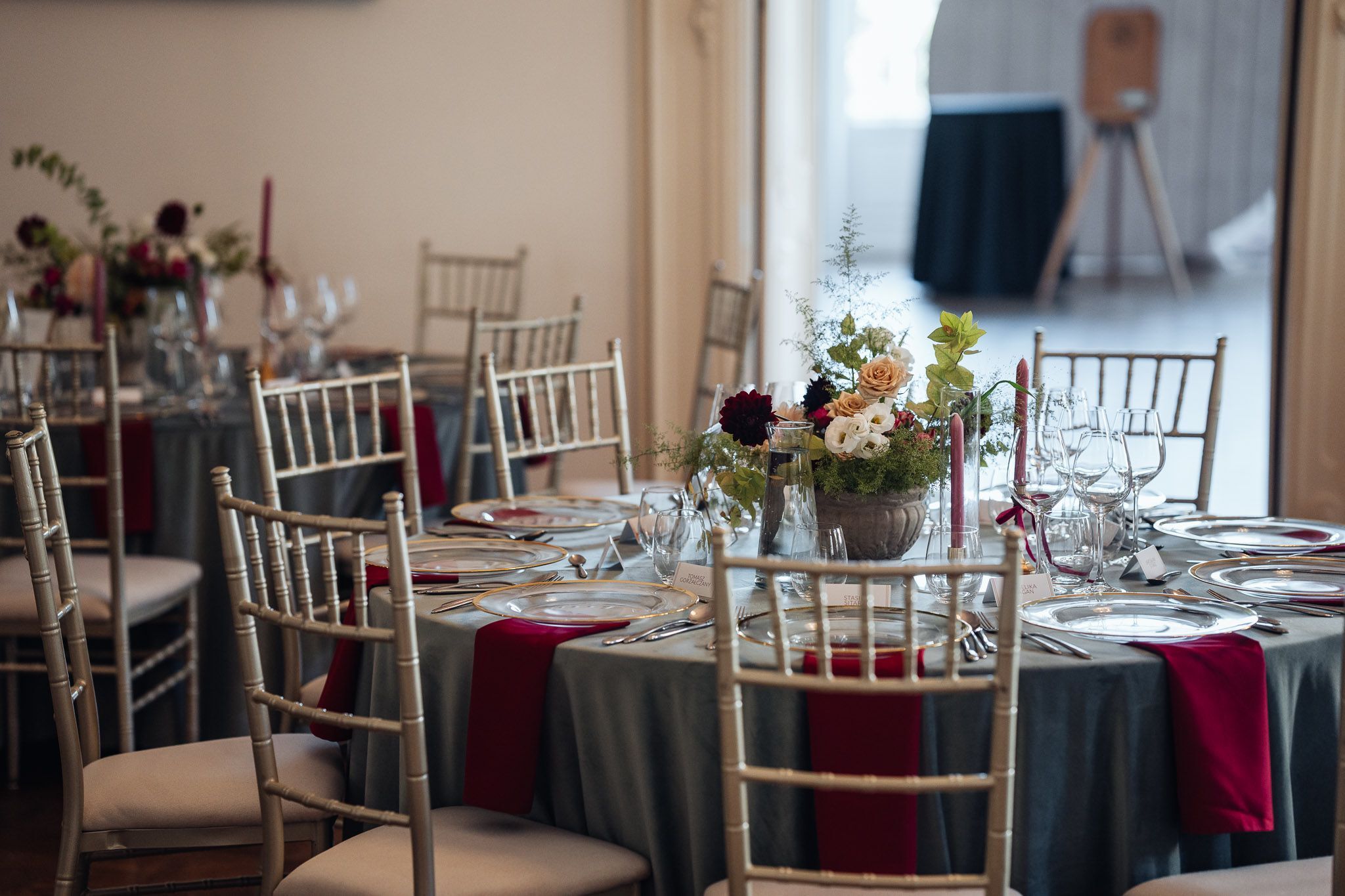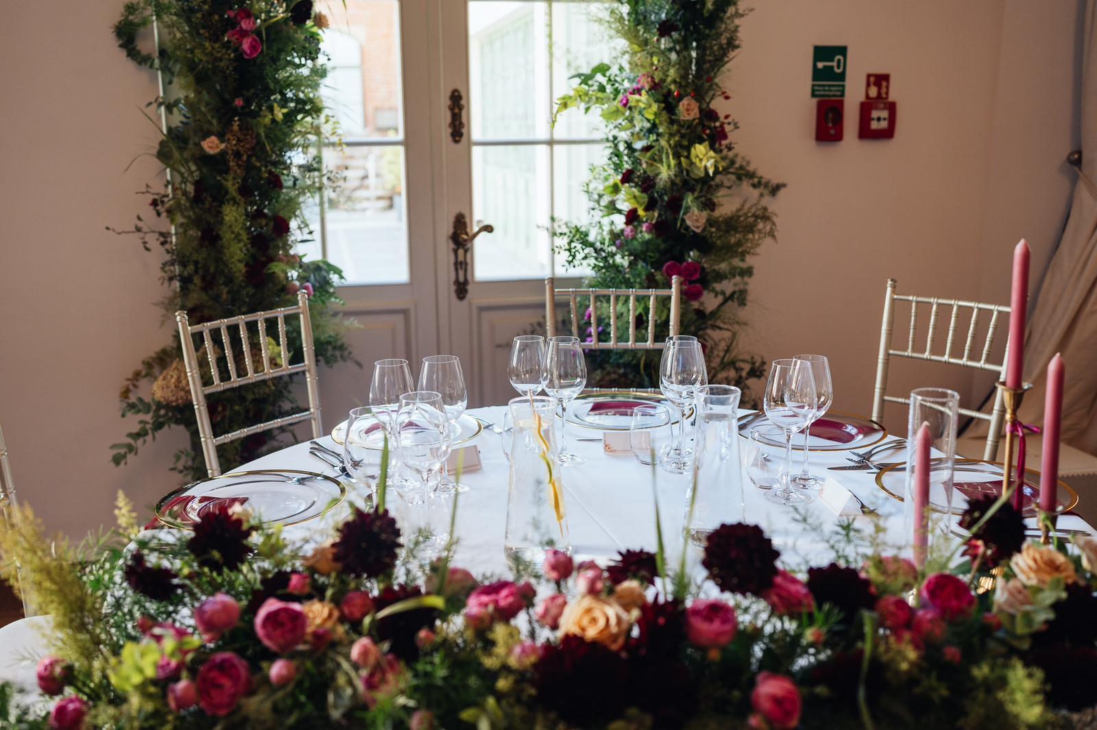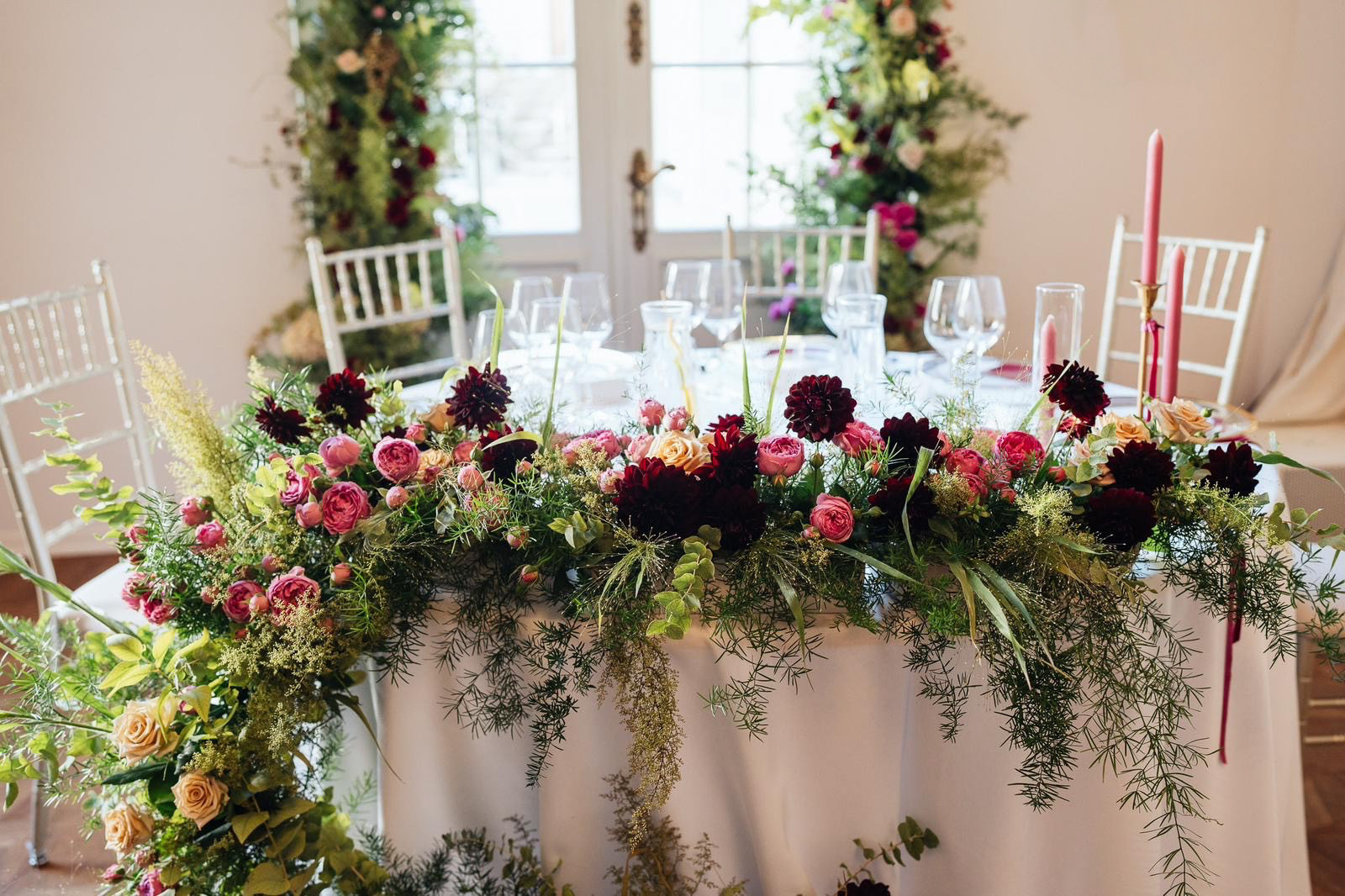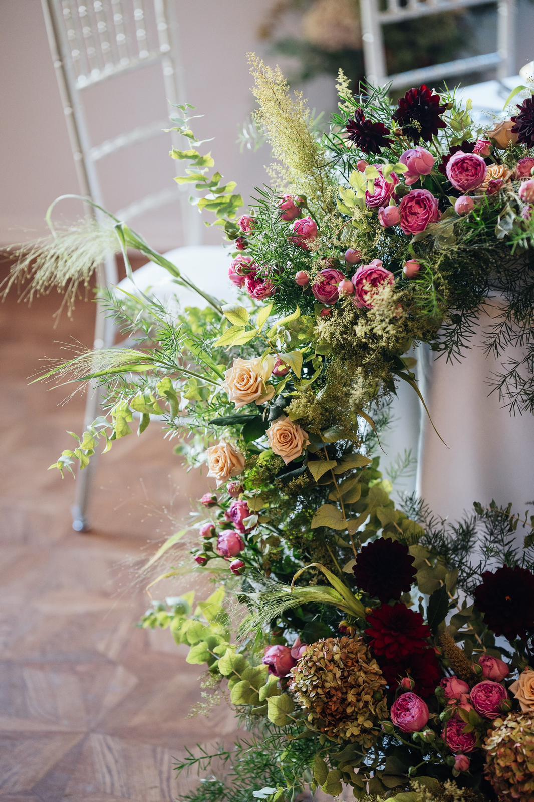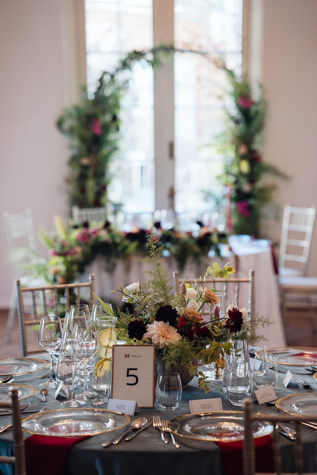 Moja współpraca z Anią i Andersem przebiegała zdalnie, ponieważ Para mieszka w Norwegii :) Pierwszy raz zobaczyliśmy się na żywo w dniu ich ślubu. Stylistyka dekoracji została dopasowana do wnętrz Pałacu - bogate kompozycje na schodach wykonałyśmy głównie z zieleni i jasnych kwiatów, by odcinały się możliwie jak najbardziej od ciemnego drewna. Kaplicę udekorowałyśmy podobnie - puszystymi wrzoścami i prosem, mchem oraz białymi kwiatami i świecami w cylindrach. Zamiast klasycznej dekoracji krzeseł postawiłyśmy za nimi zielone kompozycje. Ścianka za Parą Młodą to pergola kwiatowa zbudowana z sezonowej zieleni, ogrodowych róż oraz bordowych dalii. Wśród detali znalazły się vintage mosiężne świeczniki, a na nich zawiązane welurowe kokardki. Na okrągłych stołach znalazły się szałwiowe obrusy oraz, będące wyborem Pary, bordowe serwety. Na środku stół zdobiły niskie kompozycje w ceramicznych wazach.