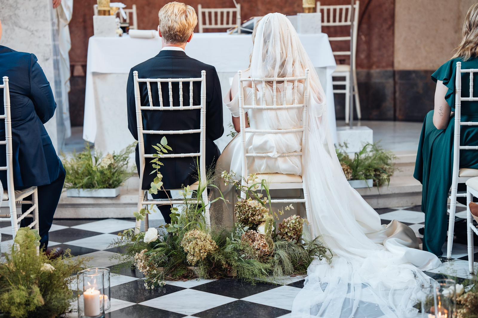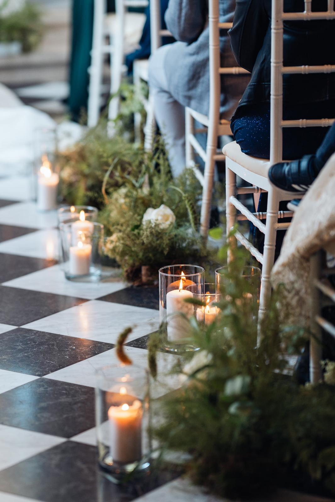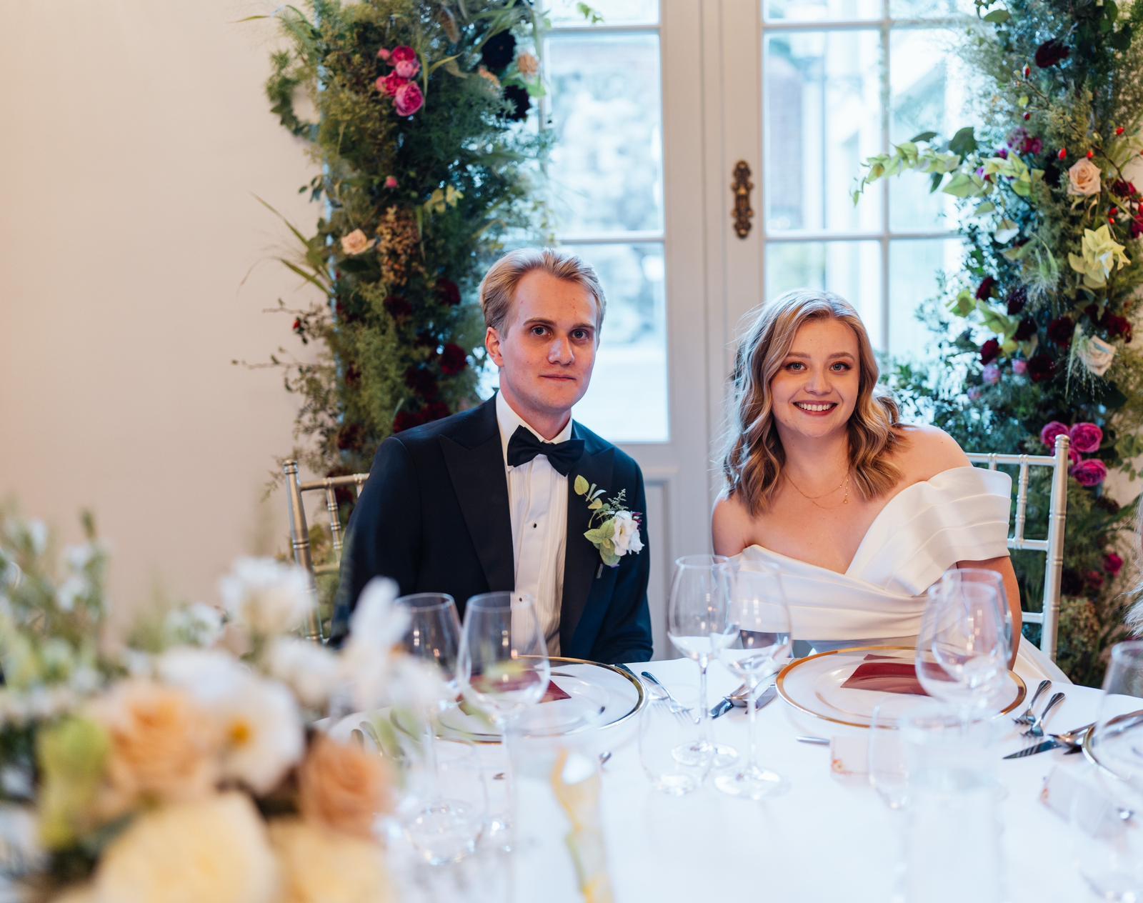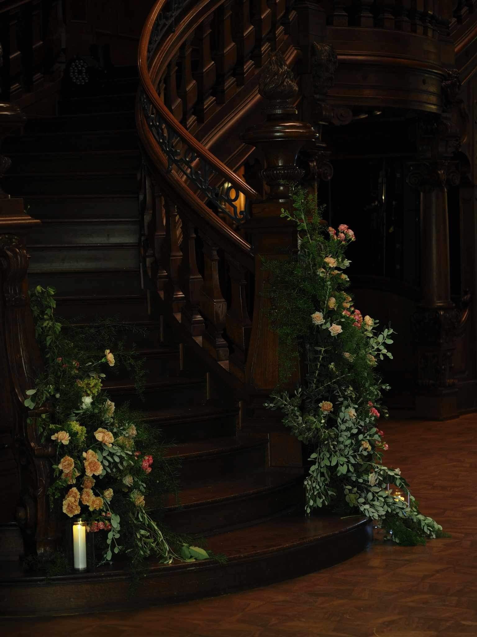 Moja współpraca z Anią i Andersem przebiegała zdalnie, ponieważ Para mieszka w Norwegii :) Pierwszy raz zobaczyliśmy się na żywo w dniu ich ślubu. Stylistyka dekoracji została dopasowana do wnętrz Pałacu - bogate kompozycje na schodach wykonałyśmy głównie z zieleni i jasnych kwiatów, by odcinały się możliwie jak najbardziej od ciemnego drewna. Kaplicę udekorowałyśmy podobnie - puszystymi wrzoścami i prosem, mchem oraz białymi kwiatami i świecami w cylindrach. Zamiast klasycznej dekoracji krzeseł postawiłyśmy za nimi zielone kompozycje. Ścianka za Parą Młodą to pergola kwiatowa zbudowana z sezonowej zieleni, ogrodowych róż oraz bordowych dalii. Wśród detali znalazły się vintage mosiężne świeczniki, a na nich zawiązane welurowe kokardki. Na okrągłych stołach znalazły się szałwiowe obrusy oraz, będące wyborem Pary, bordowe serwety. Na środku stół zdobiły niskie kompozycje w ceramicznych wazach.
