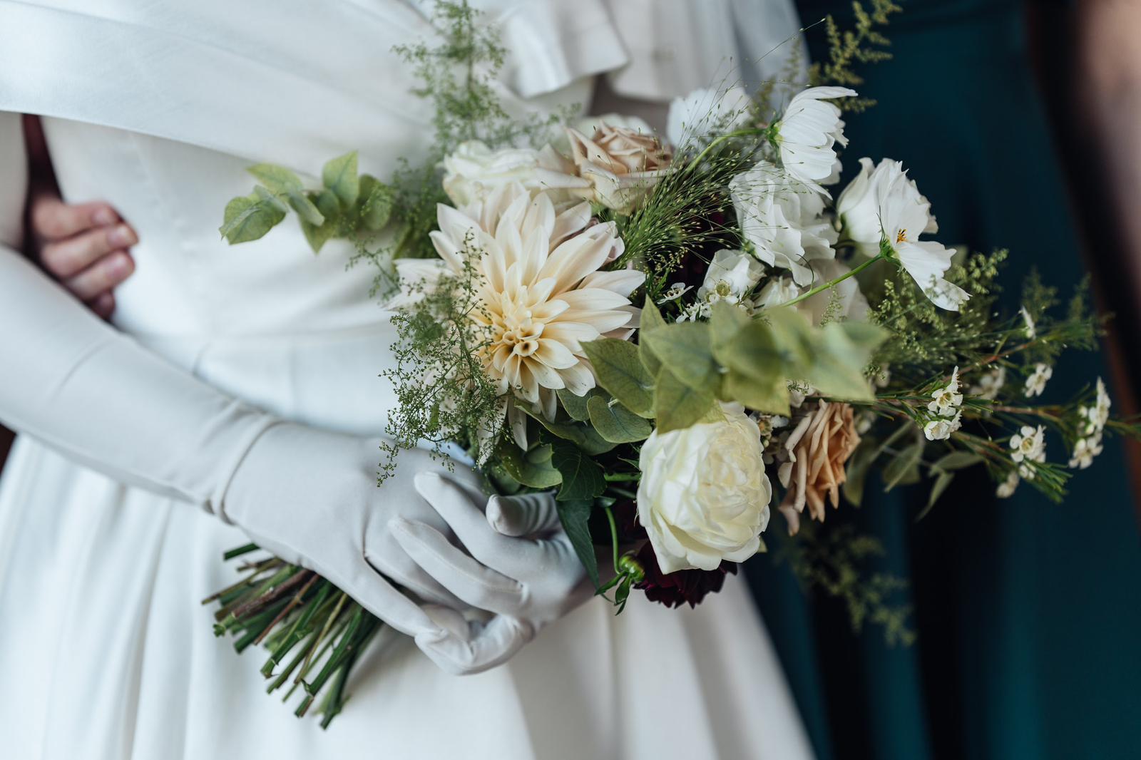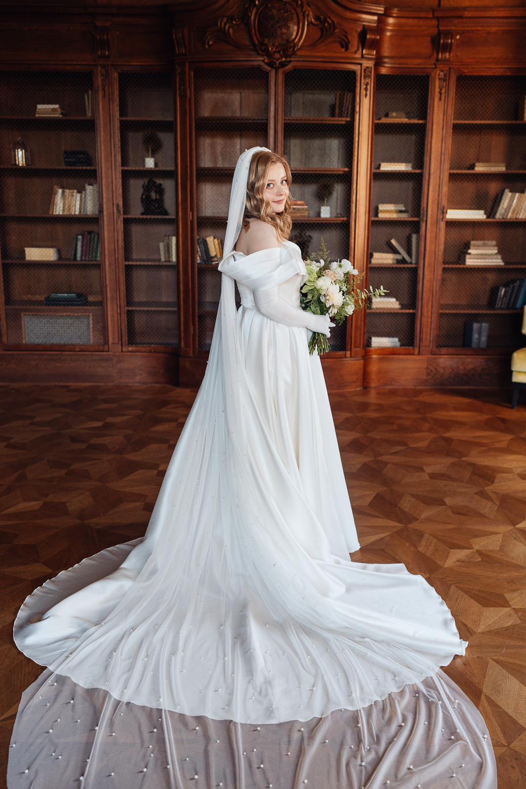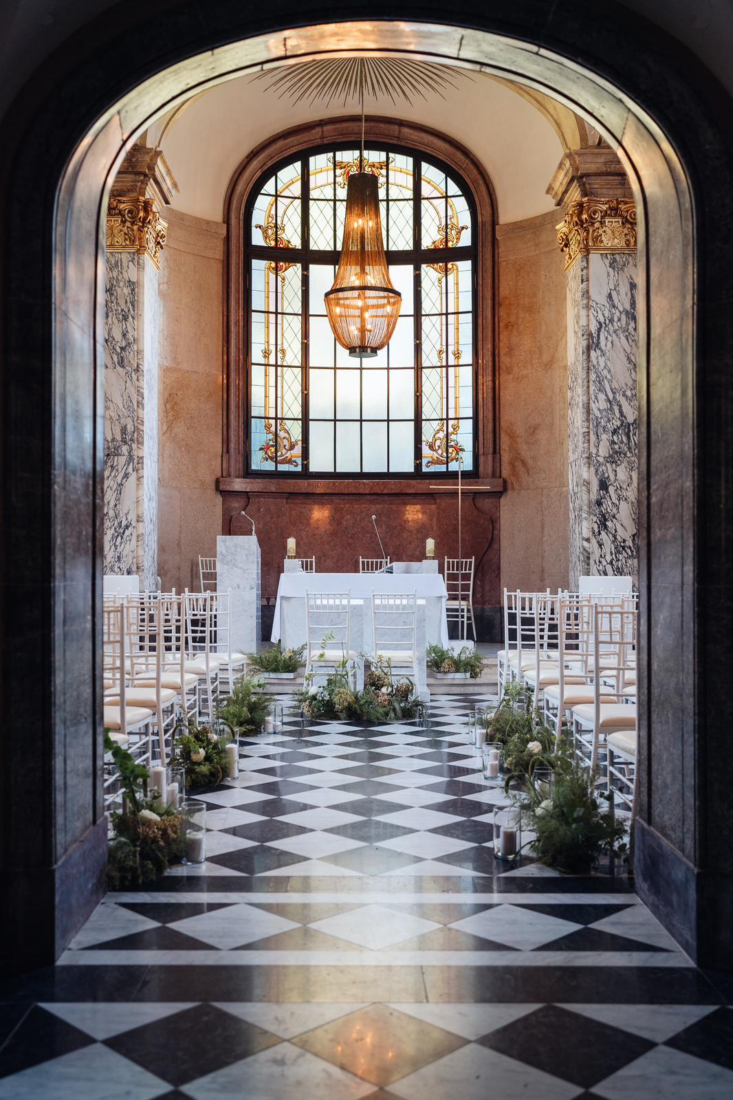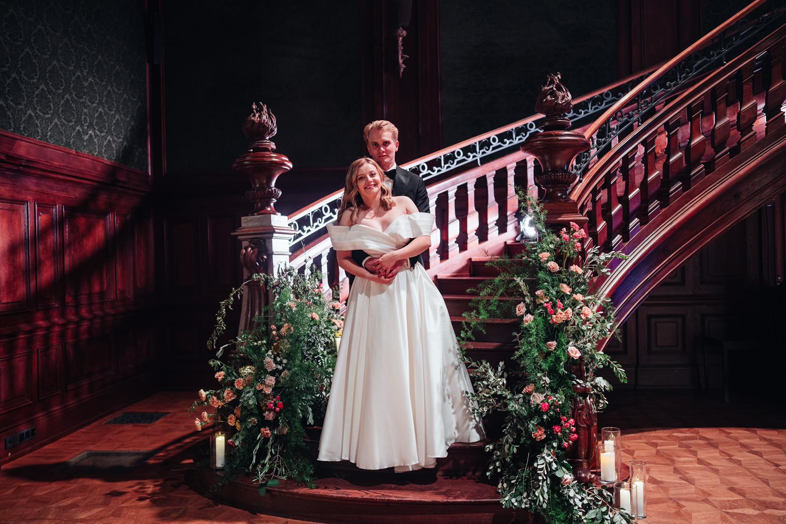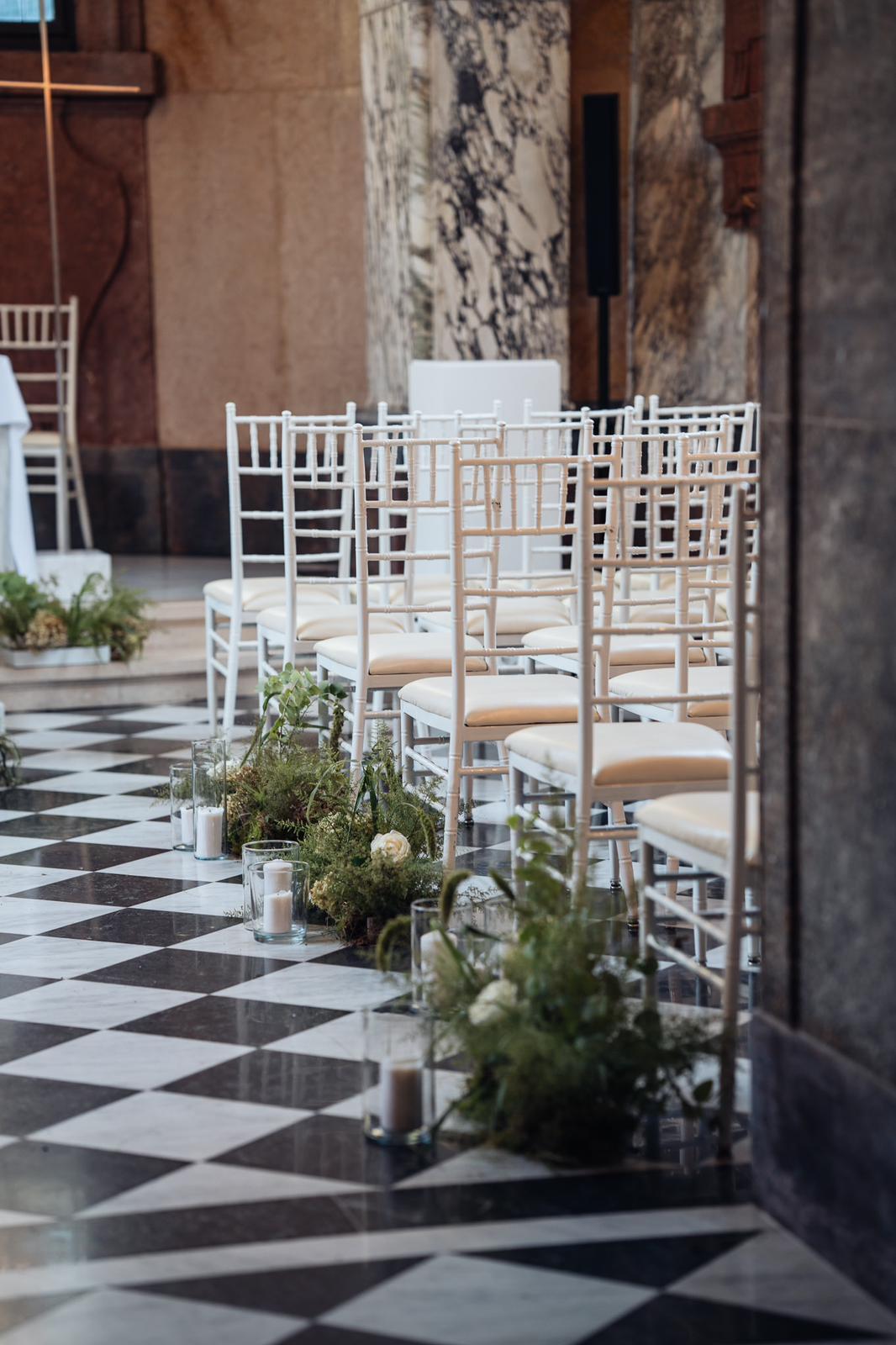 Moja współpraca z Anią i Andersem przebiegała zdalnie, ponieważ Para mieszka w Norwegii :) Pierwszy raz zobaczyliśmy się na żywo w dniu ich ślubu. Stylistyka dekoracji została dopasowana do wnętrz Pałacu - bogate kompozycje na schodach wykonałyśmy głównie z zieleni i jasnych kwiatów, by odcinały się możliwie jak najbardziej od ciemnego drewna. Kaplicę udekorowałyśmy podobnie - puszystymi wrzoścami i prosem, mchem oraz białymi kwiatami i świecami w cylindrach. Zamiast klasycznej dekoracji krzeseł postawiłyśmy za nimi zielone kompozycje. Ścianka za Parą Młodą to pergola kwiatowa zbudowana z sezonowej zieleni, ogrodowych róż oraz bordowych dalii. Wśród detali znalazły się vintage mosiężne świeczniki, a na nich zawiązane welurowe kokardki. Na okrągłych stołach znalazły się szałwiowe obrusy oraz, będące wyborem Pary, bordowe serwety. Na środku stół zdobiły niskie kompozycje w ceramicznych wazach.
