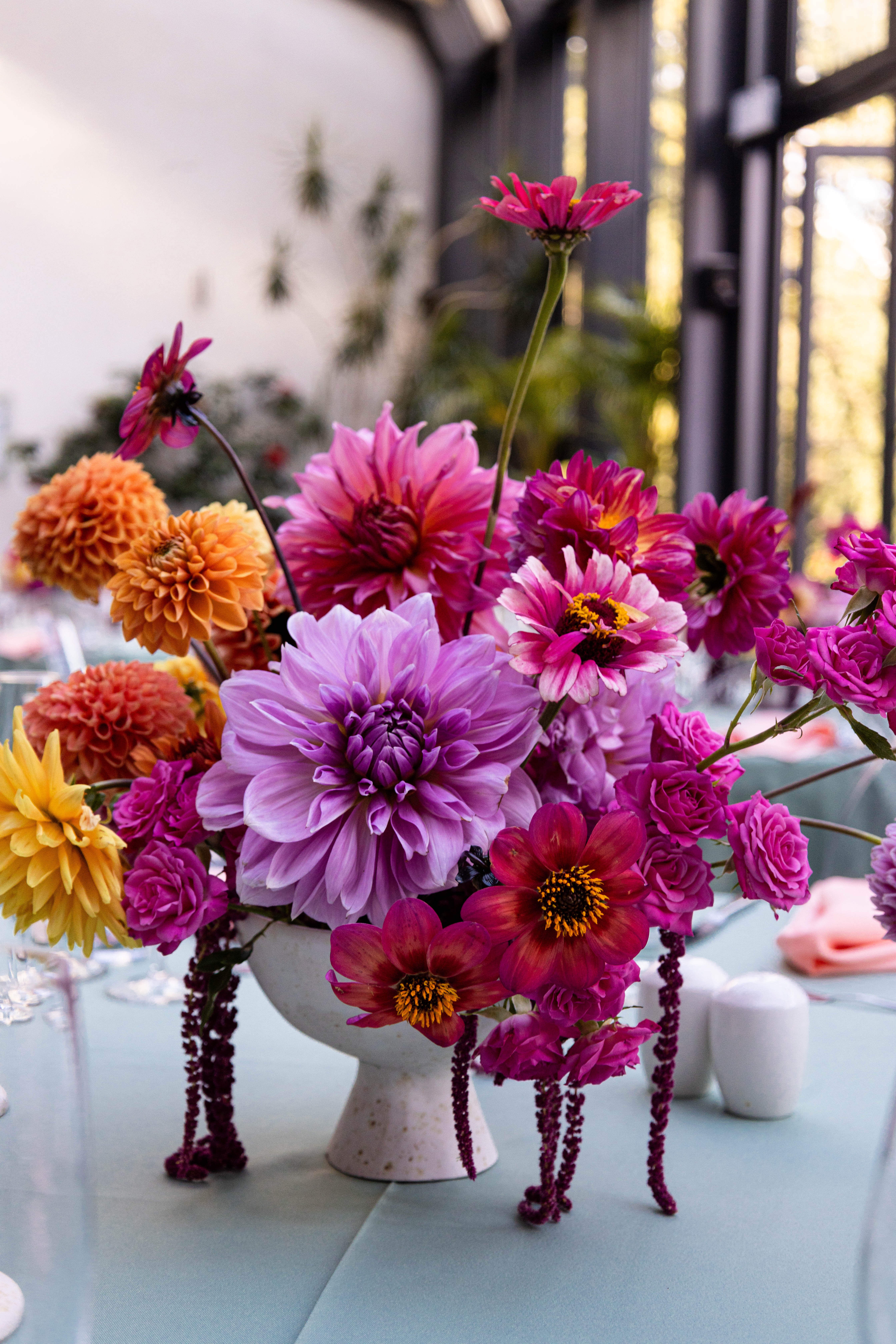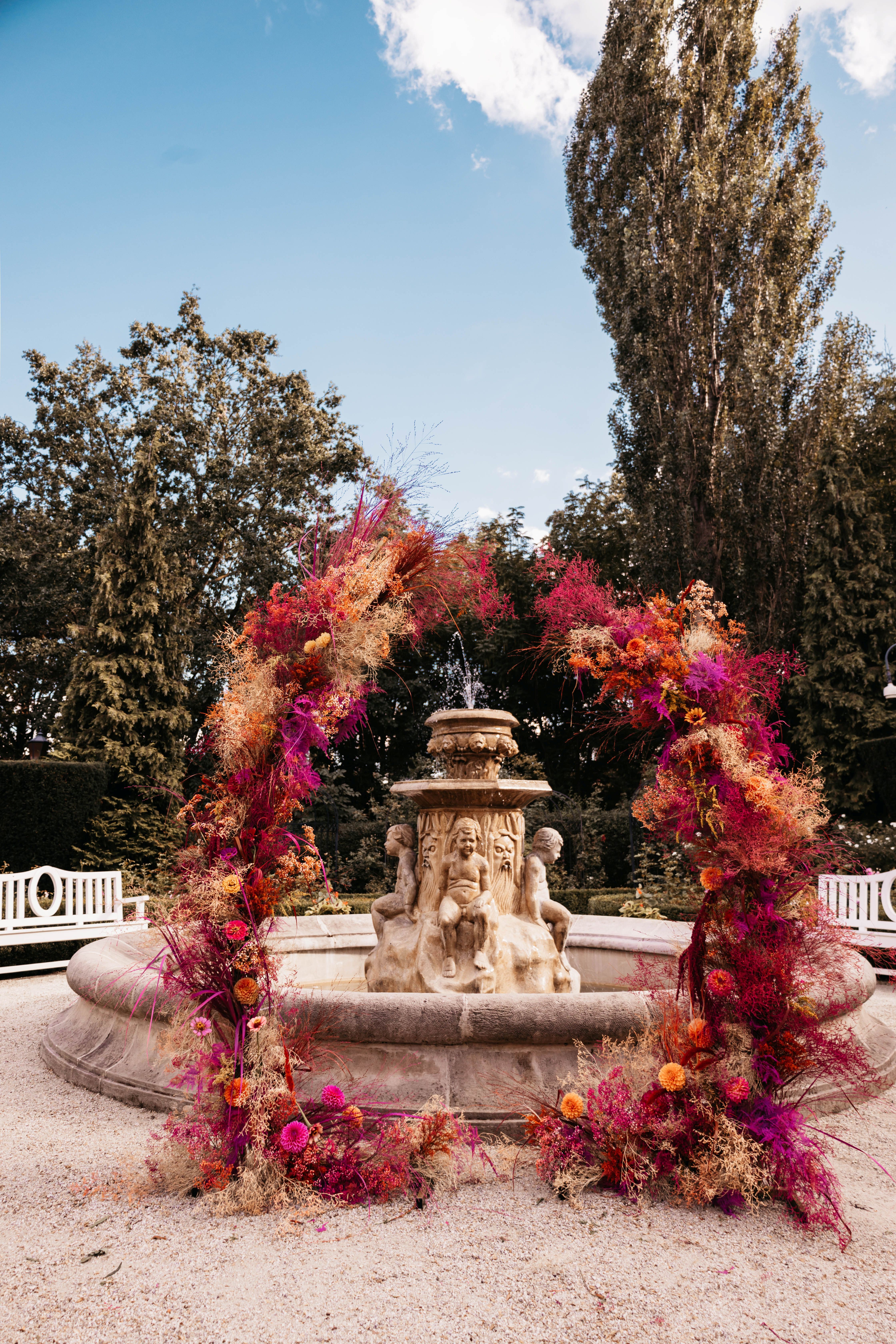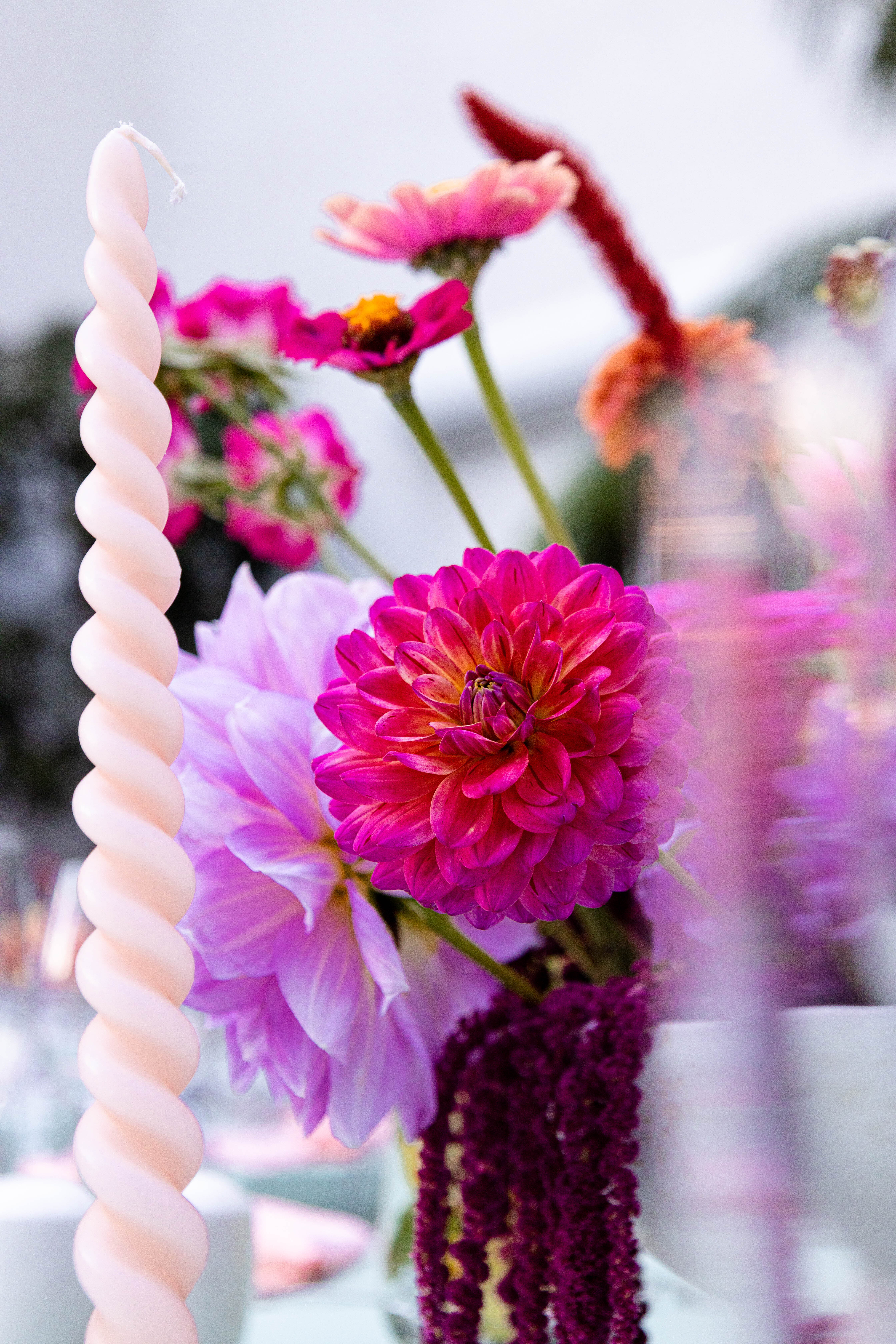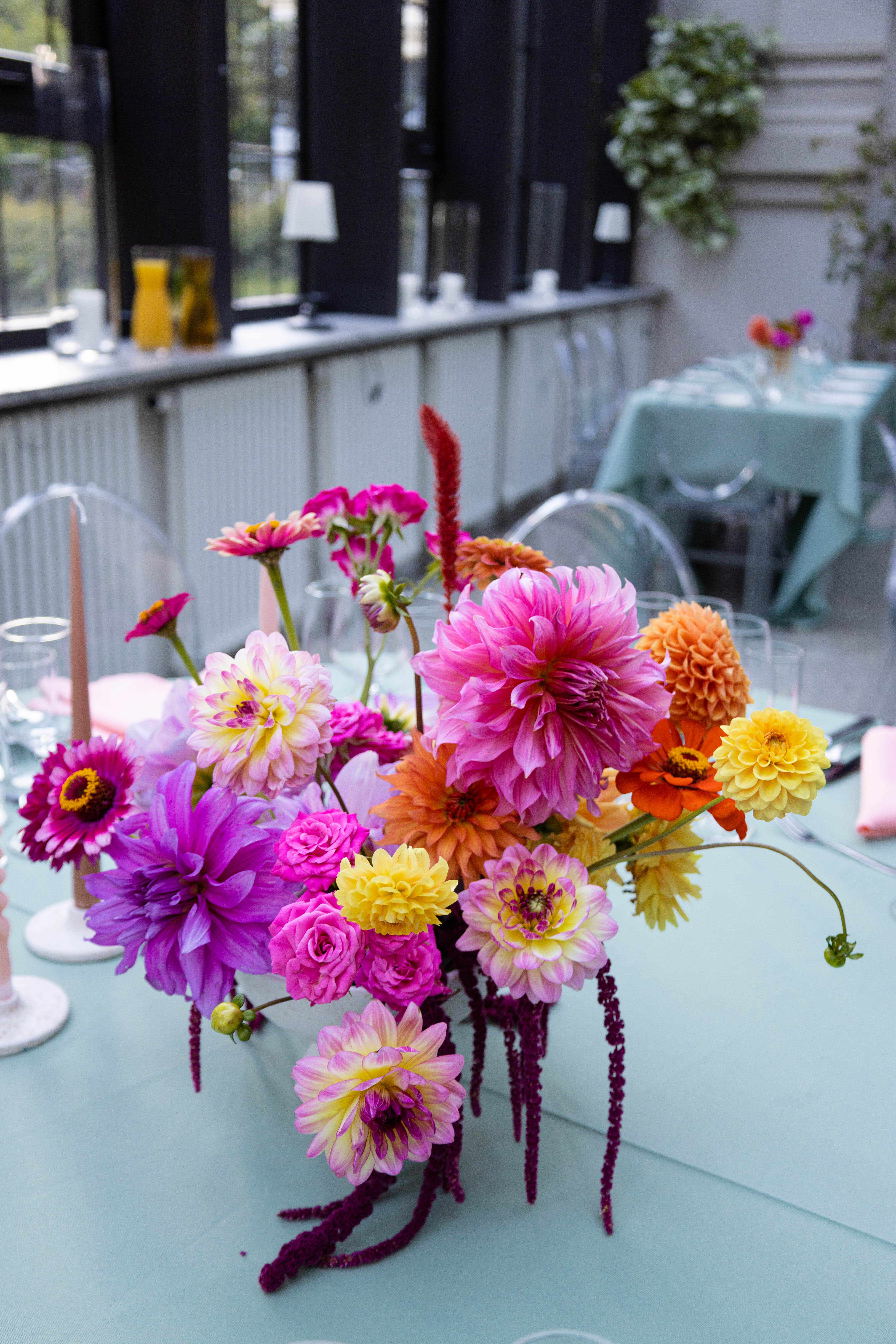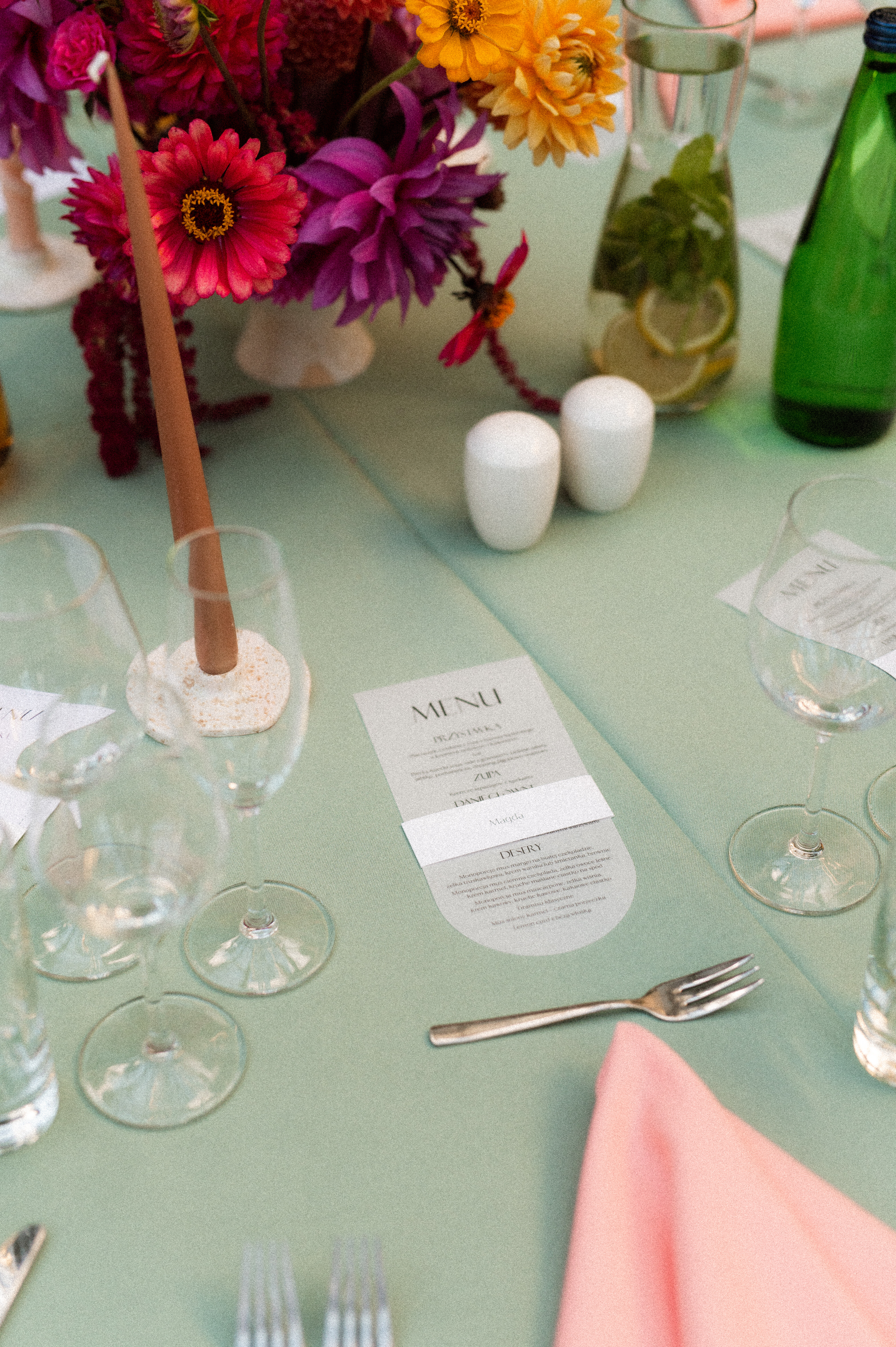 Ślub i wesele Antoniny i Olgierda odbyły się w architektonicznej perełce Łodzi - w ogrodzie i oranżerii Pałacu Herbsta na Księżym Młynie. To mocna, kontrastowa aranżacja oparta na różu i pomarańczu bez dodatku zieleni. Robiąca ogromne wrażenie ścianka ślubna została wykonana z farbowanego suszu oraz żywych, kolorowych dalii i gałązkowych róż. Bukiet Tosi to minimalistyczna wiązanka z kilku kolorowych dalii. Okrągłe stoły zostały nakryte miętowymi obrusami i brzoskwiniowymi serwetami, z którymi pięknie kontrastowały nacycone oranże i fuksje kompozycji w naczyniach.