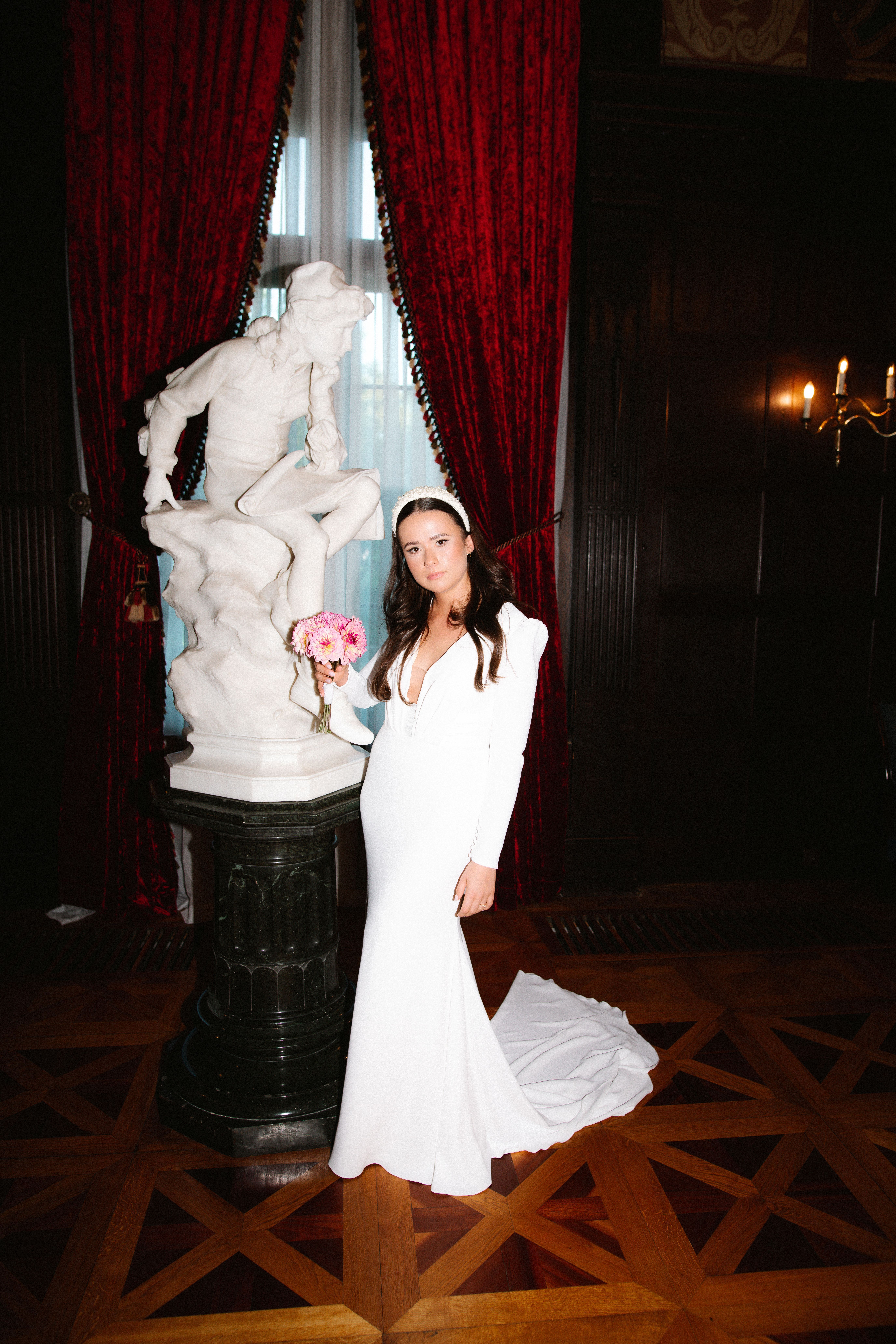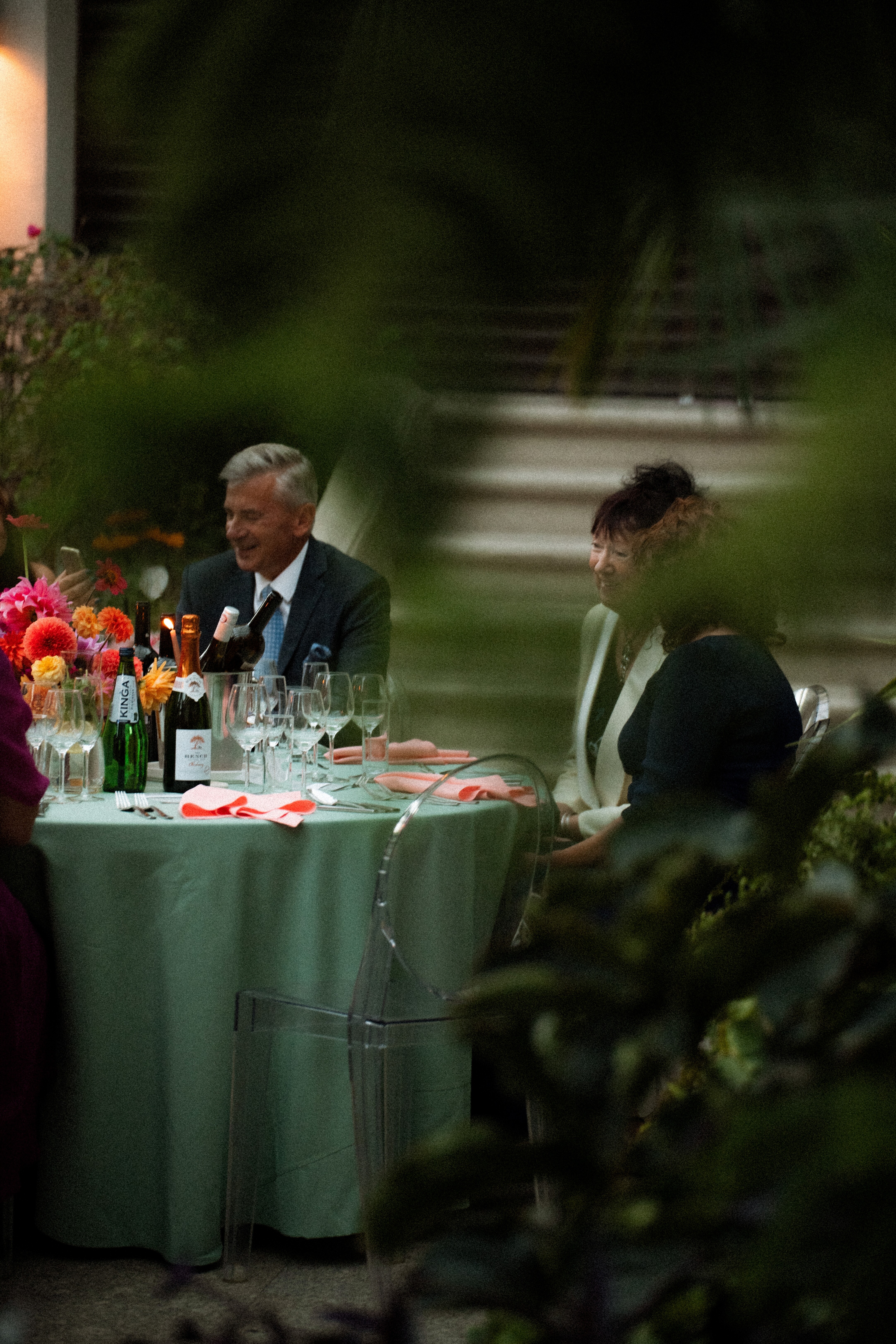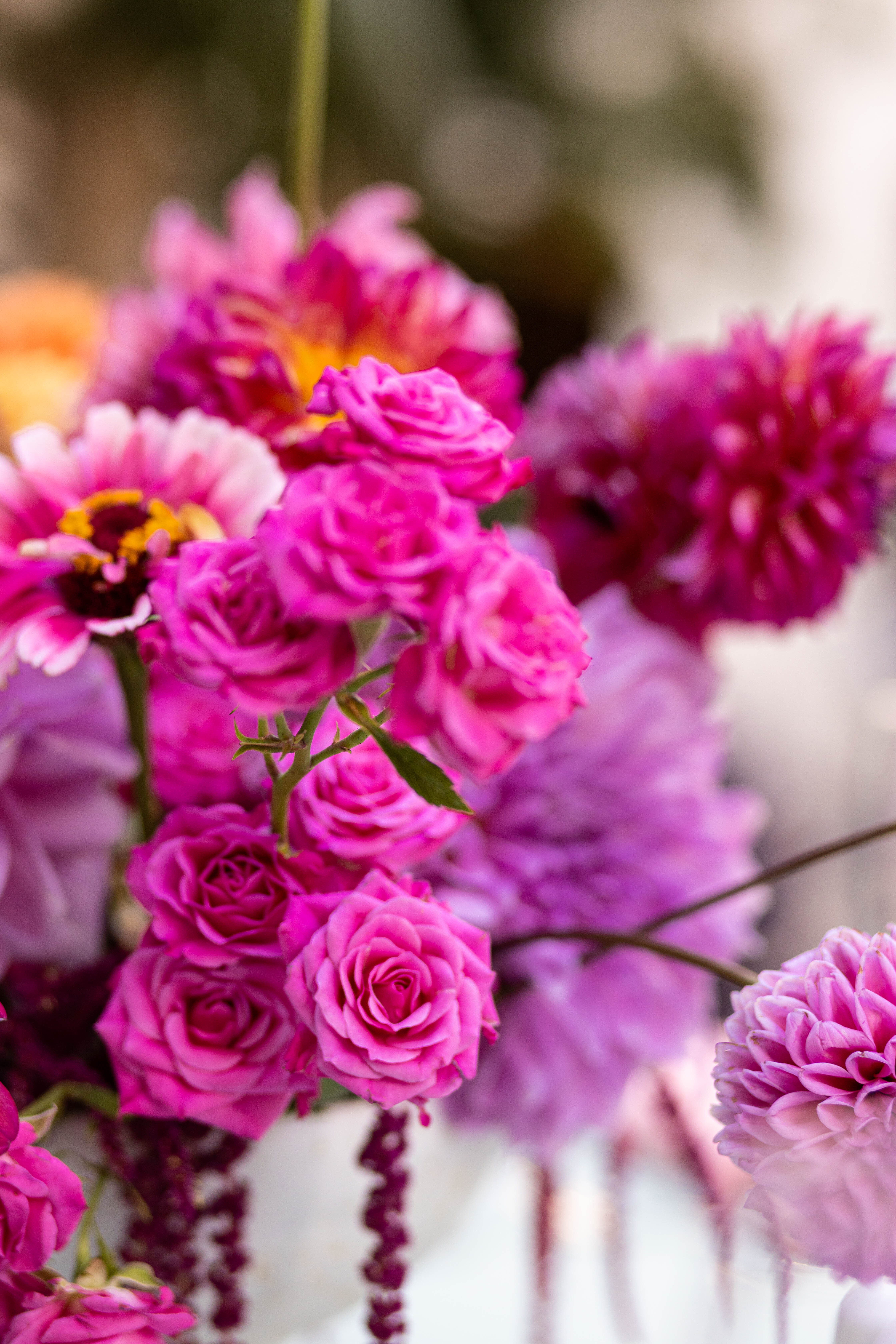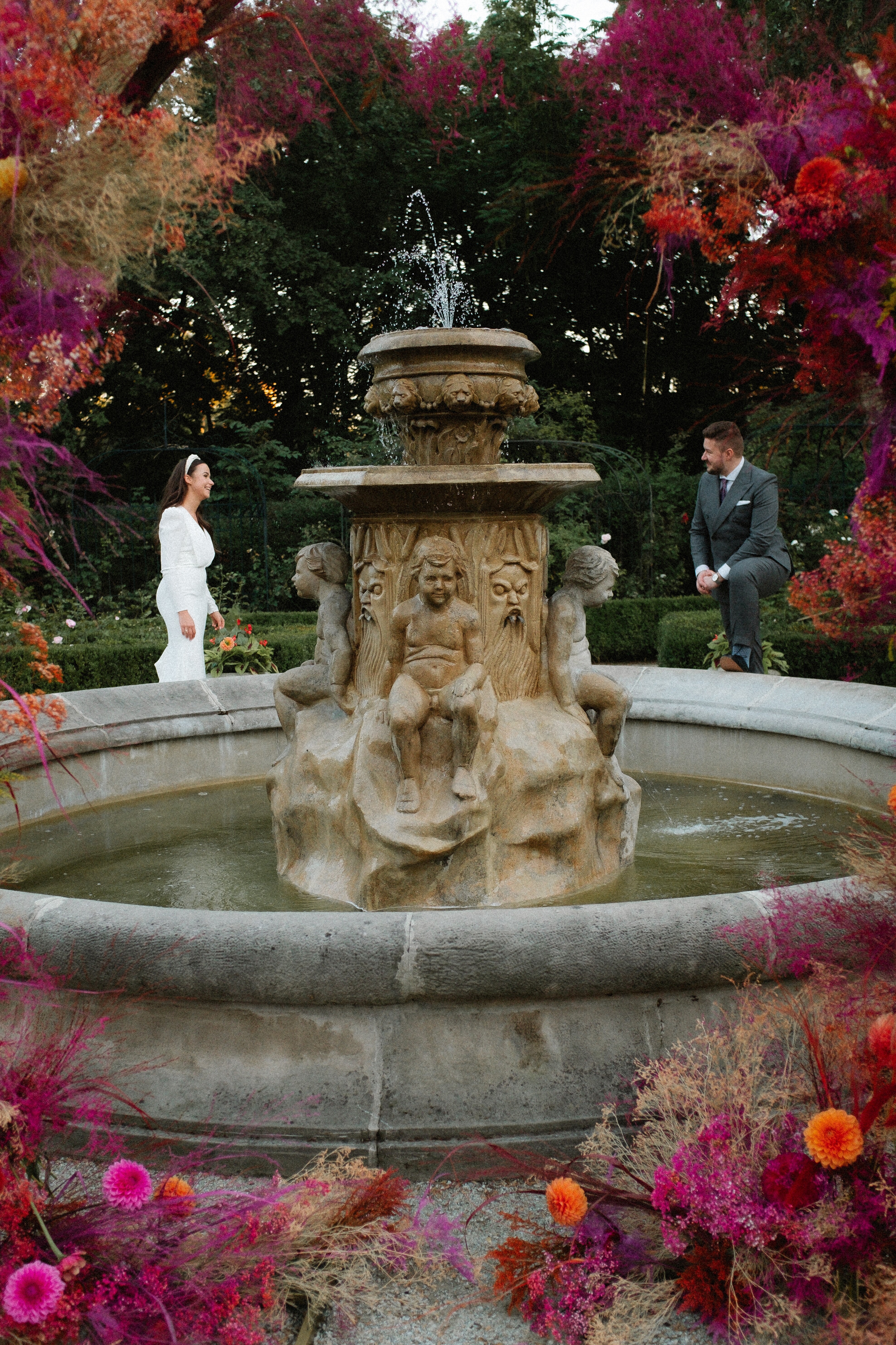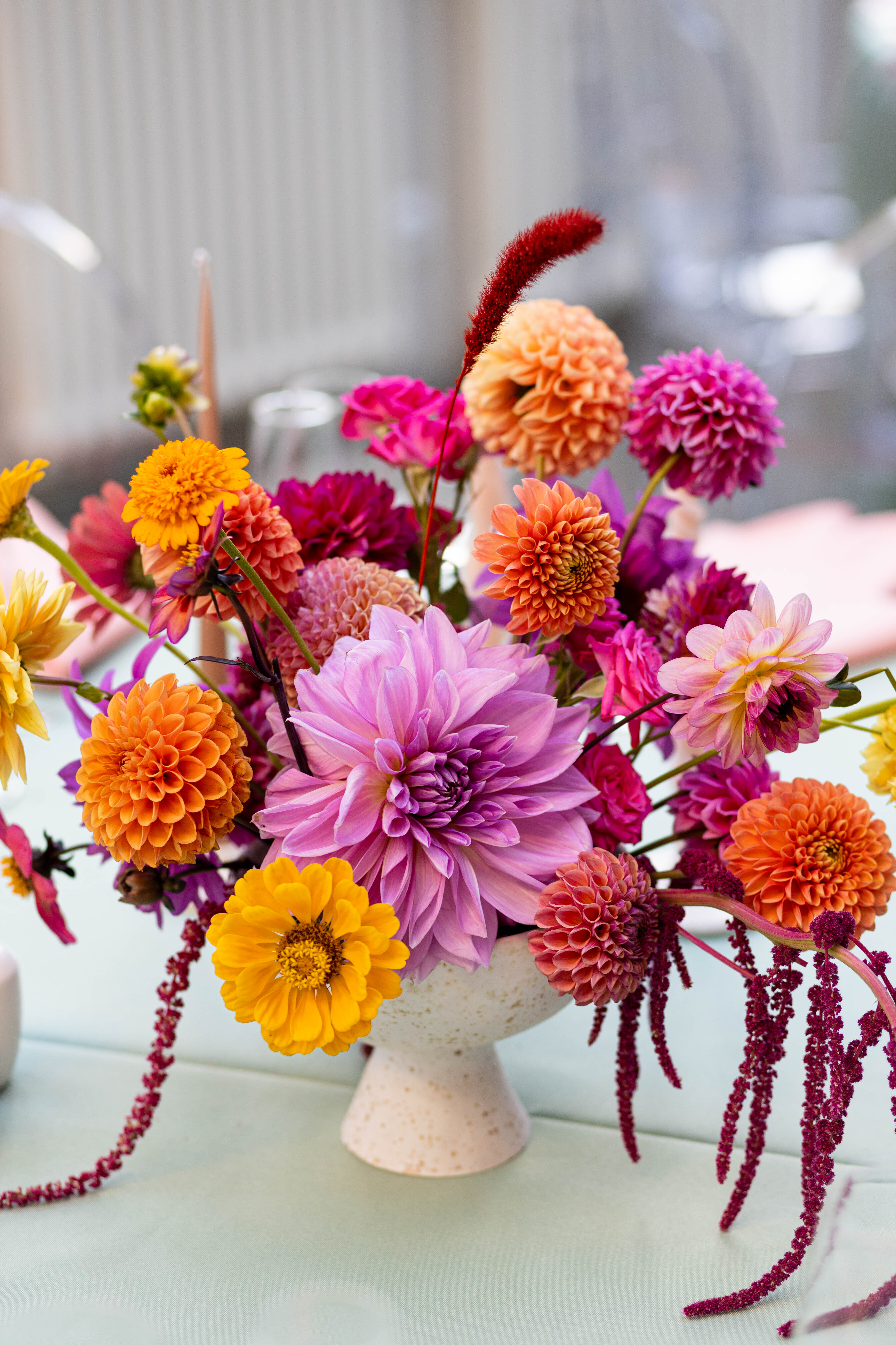 Ślub i wesele Antoniny i Olgierda odbyły się w architektonicznej perełce Łodzi - w ogrodzie i oranżerii Pałacu Herbsta na Księżym Młynie. To mocna, kontrastowa aranżacja oparta na różu i pomarańczu bez dodatku zieleni. Robiąca ogromne wrażenie ścianka ślubna została wykonana z farbowanego suszu oraz żywych, kolorowych dalii i gałązkowych róż. Bukiet Tosi to minimalistyczna wiązanka z kilku kolorowych dalii. Okrągłe stoły zostały nakryte miętowymi obrusami i brzoskwiniowymi serwetami, z którymi pięknie kontrastowały nacycone oranże i fuksje kompozycji w naczyniach.