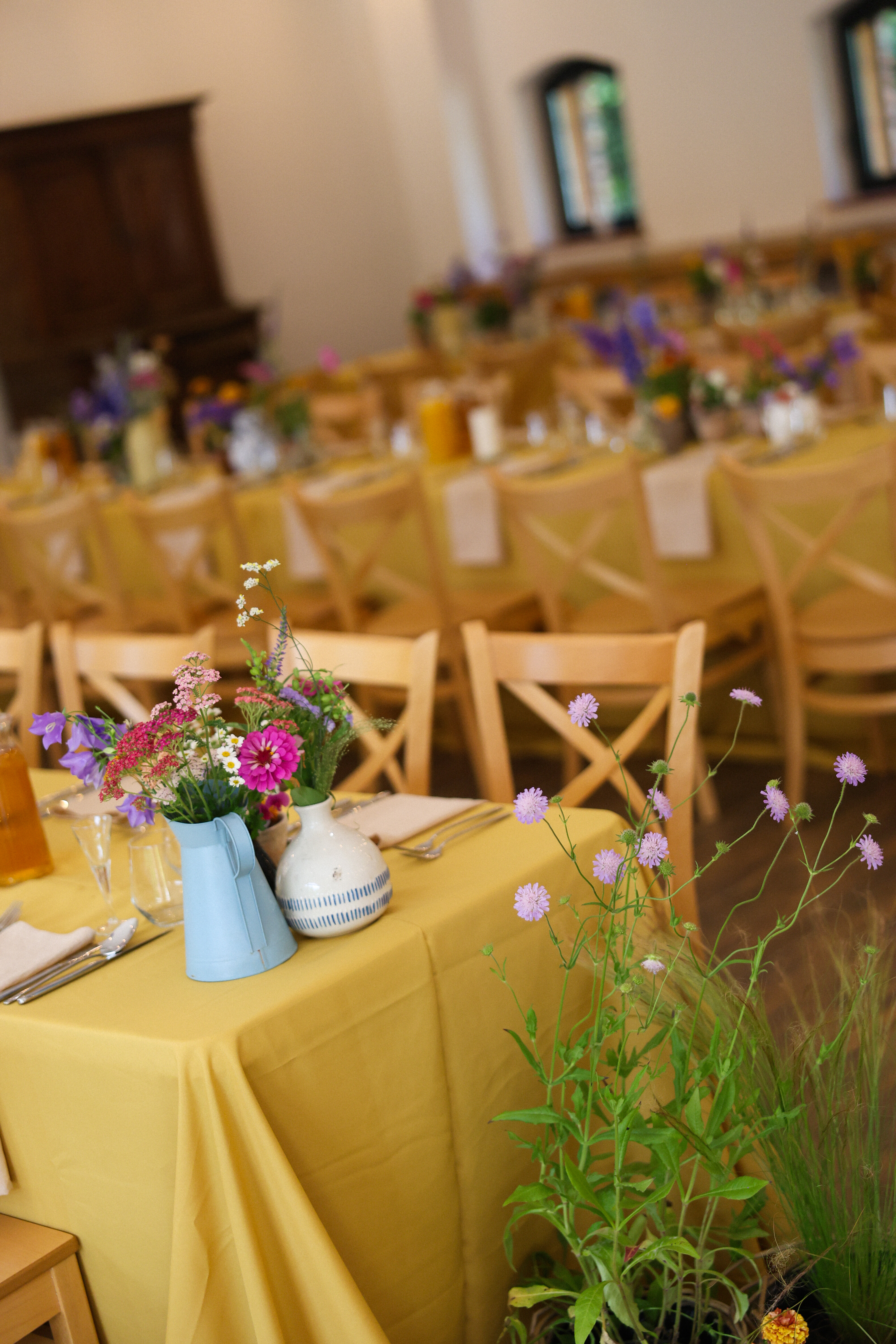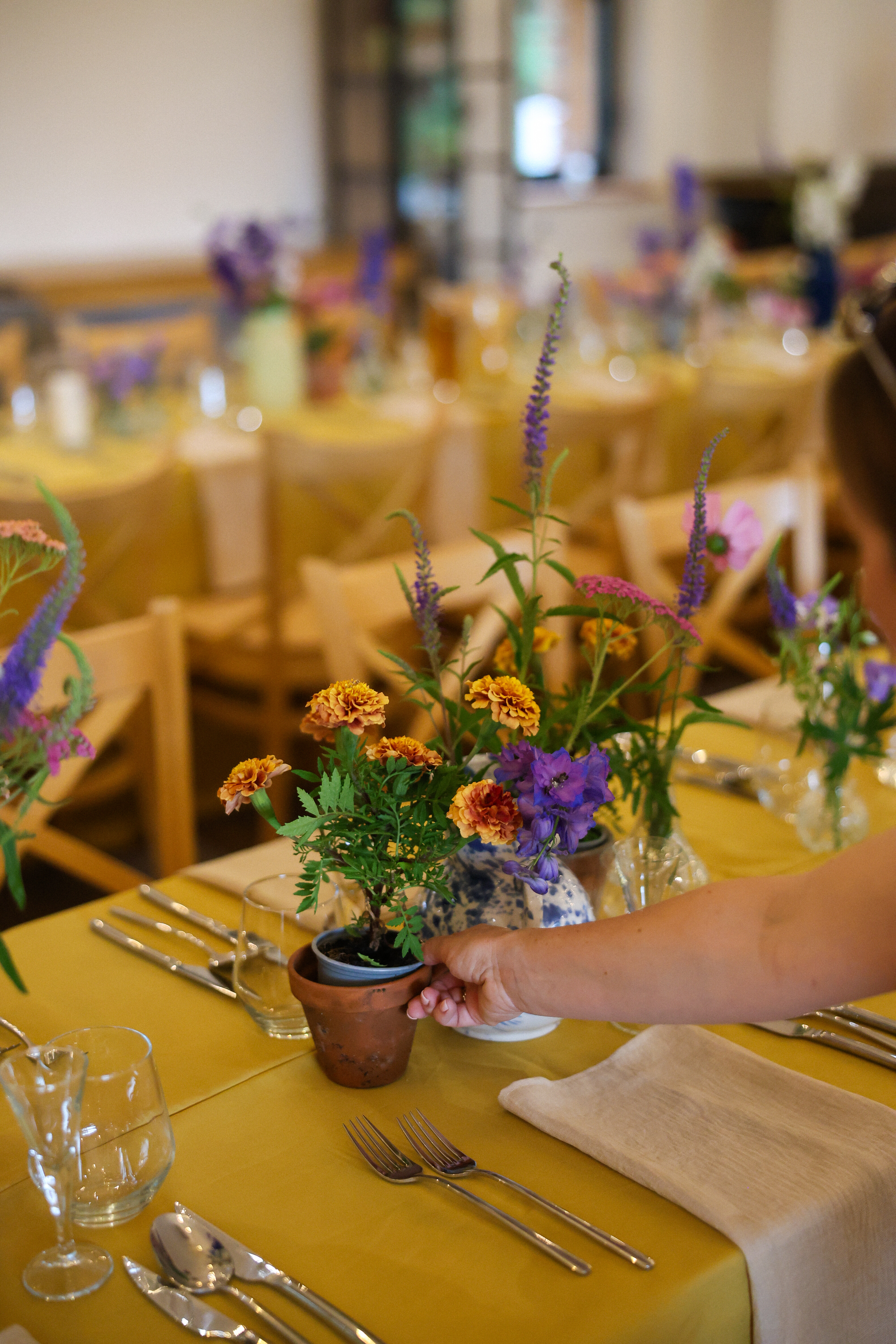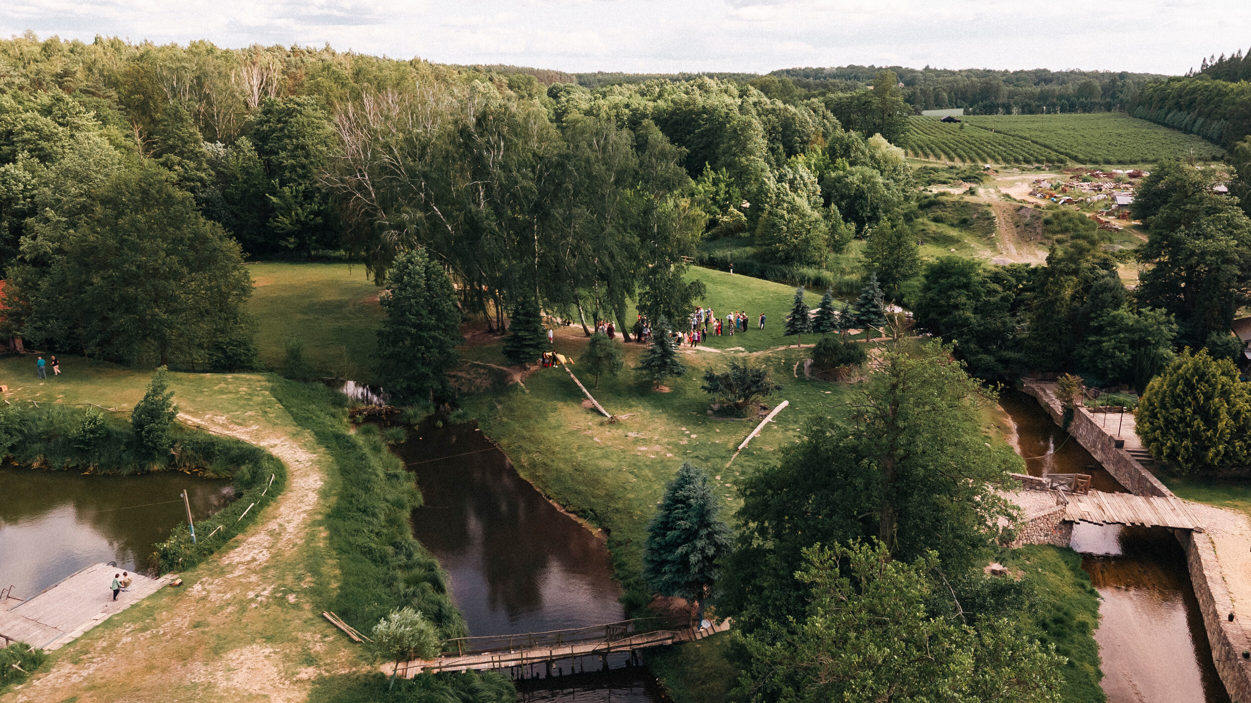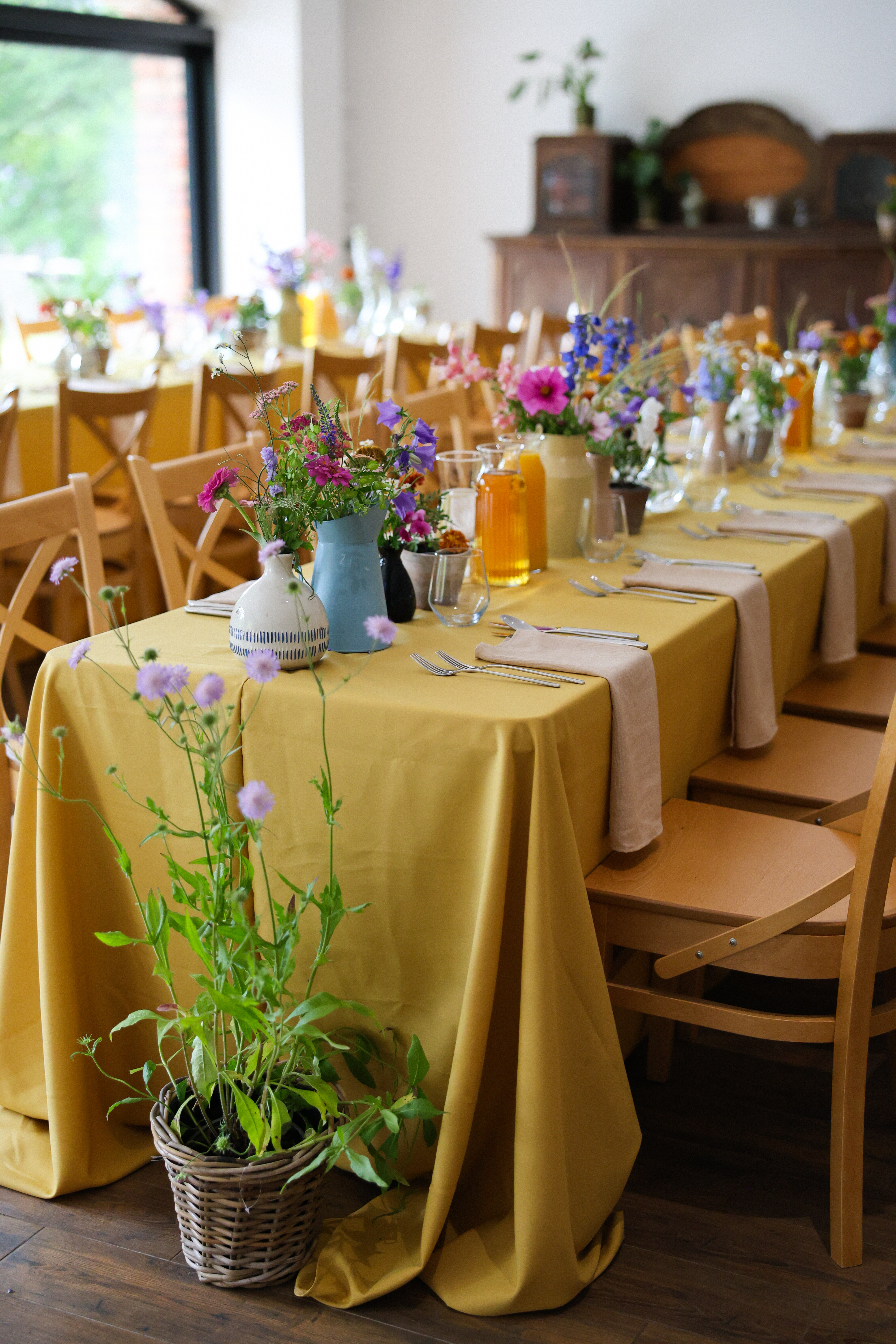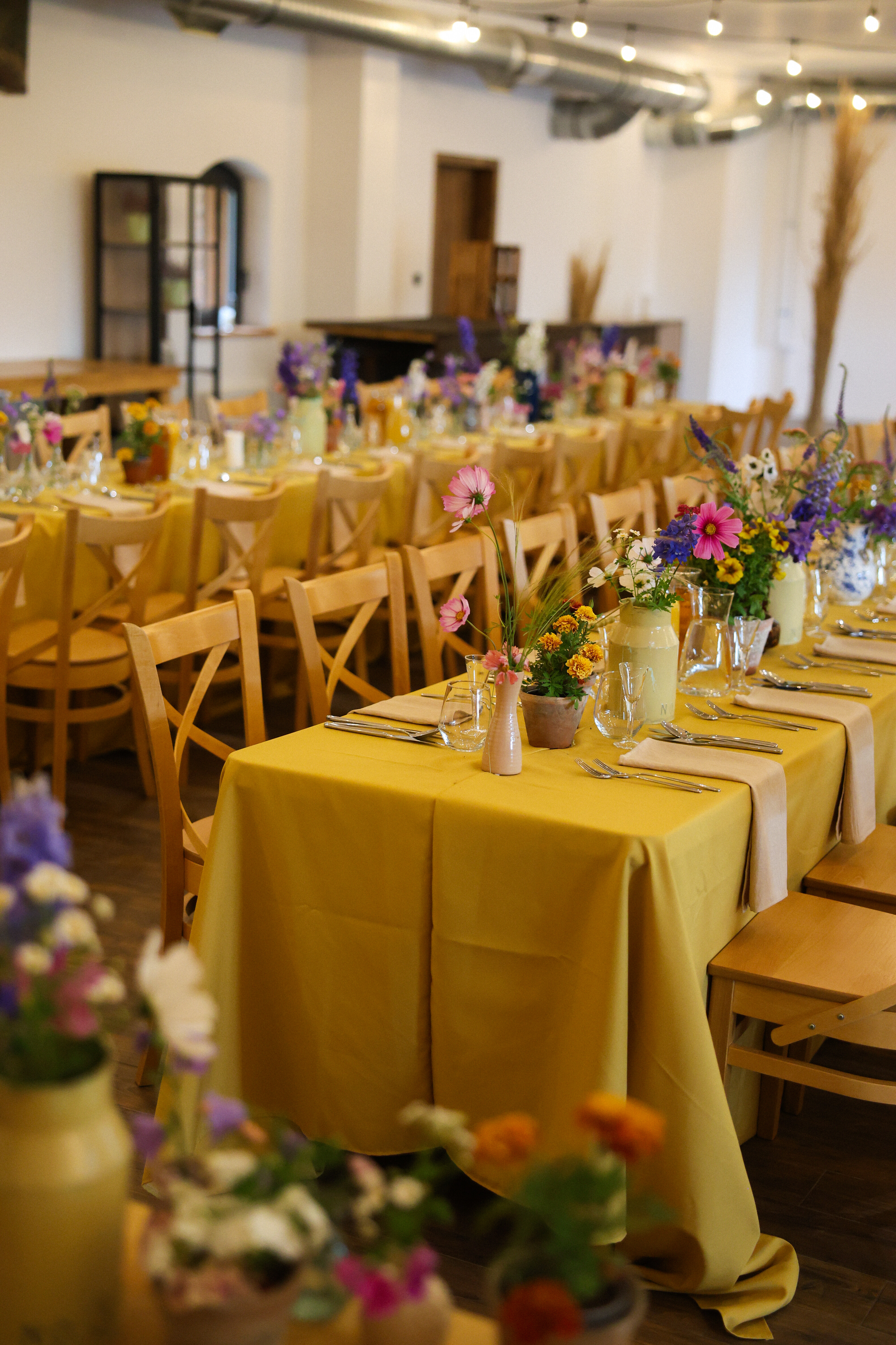 Plenerowy ślub Karo i Marcina odbył się na terenie Krainy Dzikiej Kaczki - wśród drzew, na tle ponad stuletniej futryny, którą ozdobiłyśmy wstążkami. Reszta dekoracji tego miejsca to inwencja twórcza właścicielki obiektu :) Poprzestawiała nasze dekoracje i zrobiła nam tym niezłego psikusa! Całokształt miał być utrzymany w sielskim, rustykalnym klimacie. Wykorzystałyśmy w aranżacjach stare kanki, terakotowe doniczki z kwiatami, które później zabrali nasi klienci. Mix ceramicznych i szklanych wazoników z wielokolorowymi kwiatami ozdobił stoły, które nakryłyśmy miodowymi obrusami.