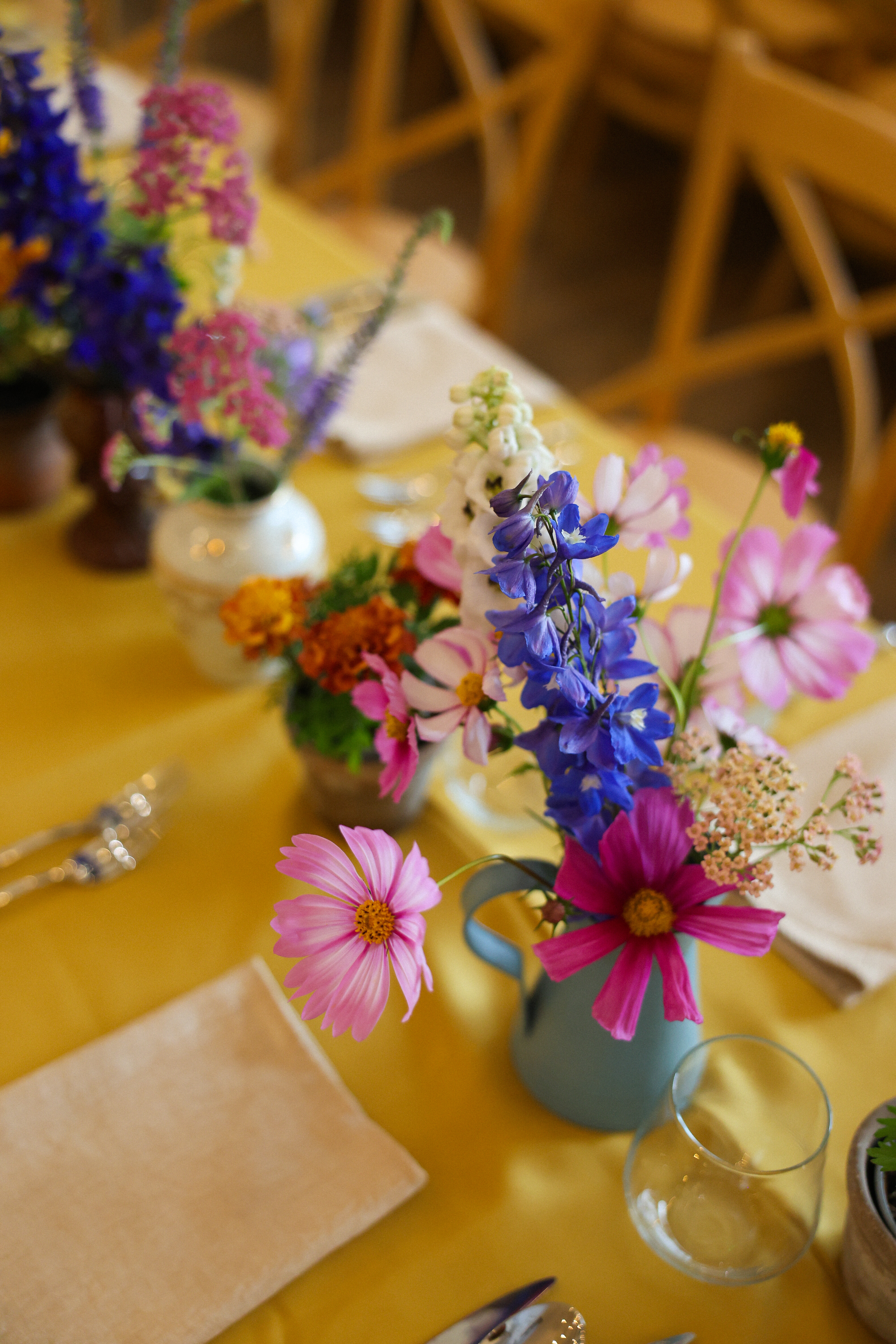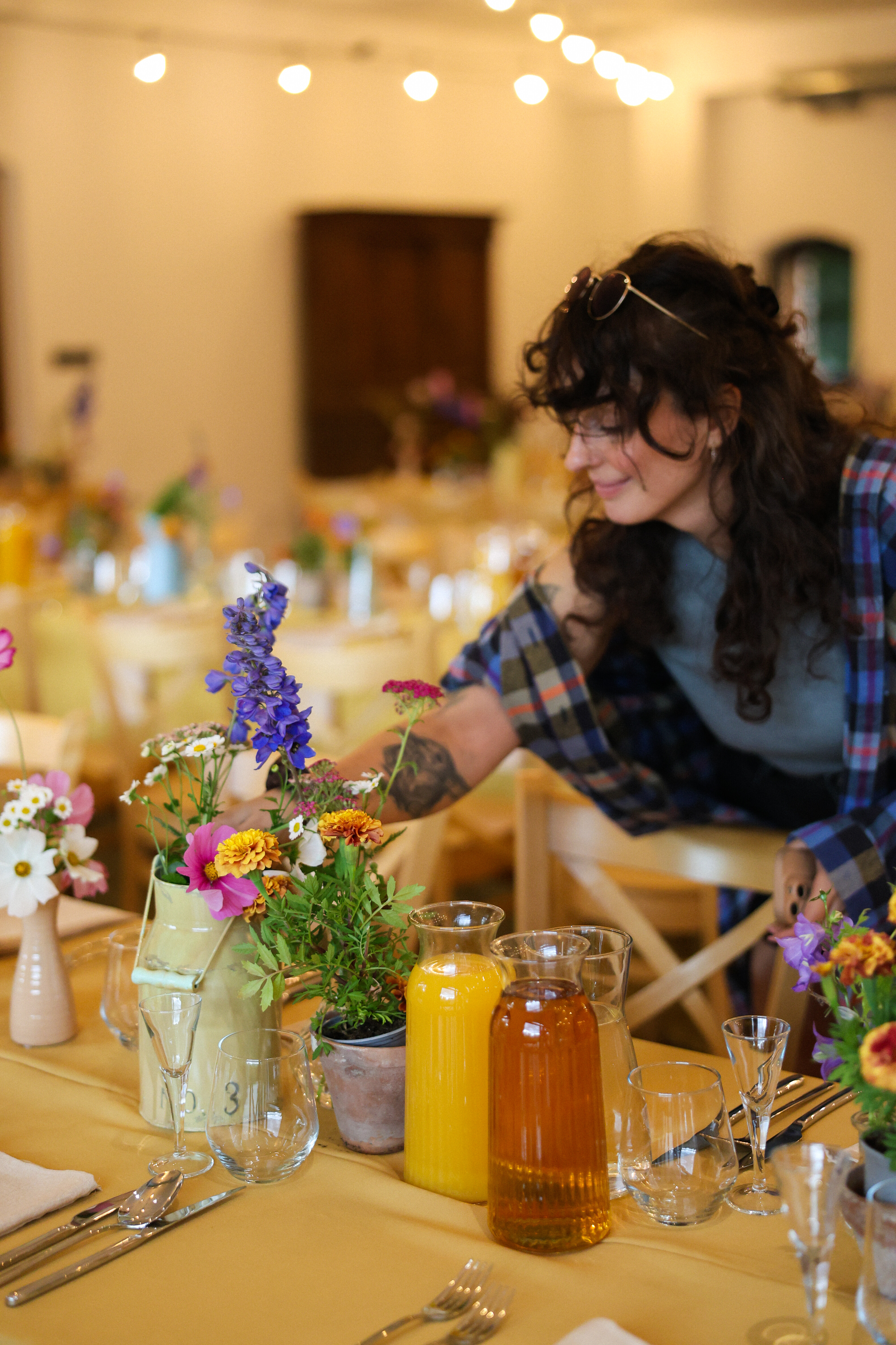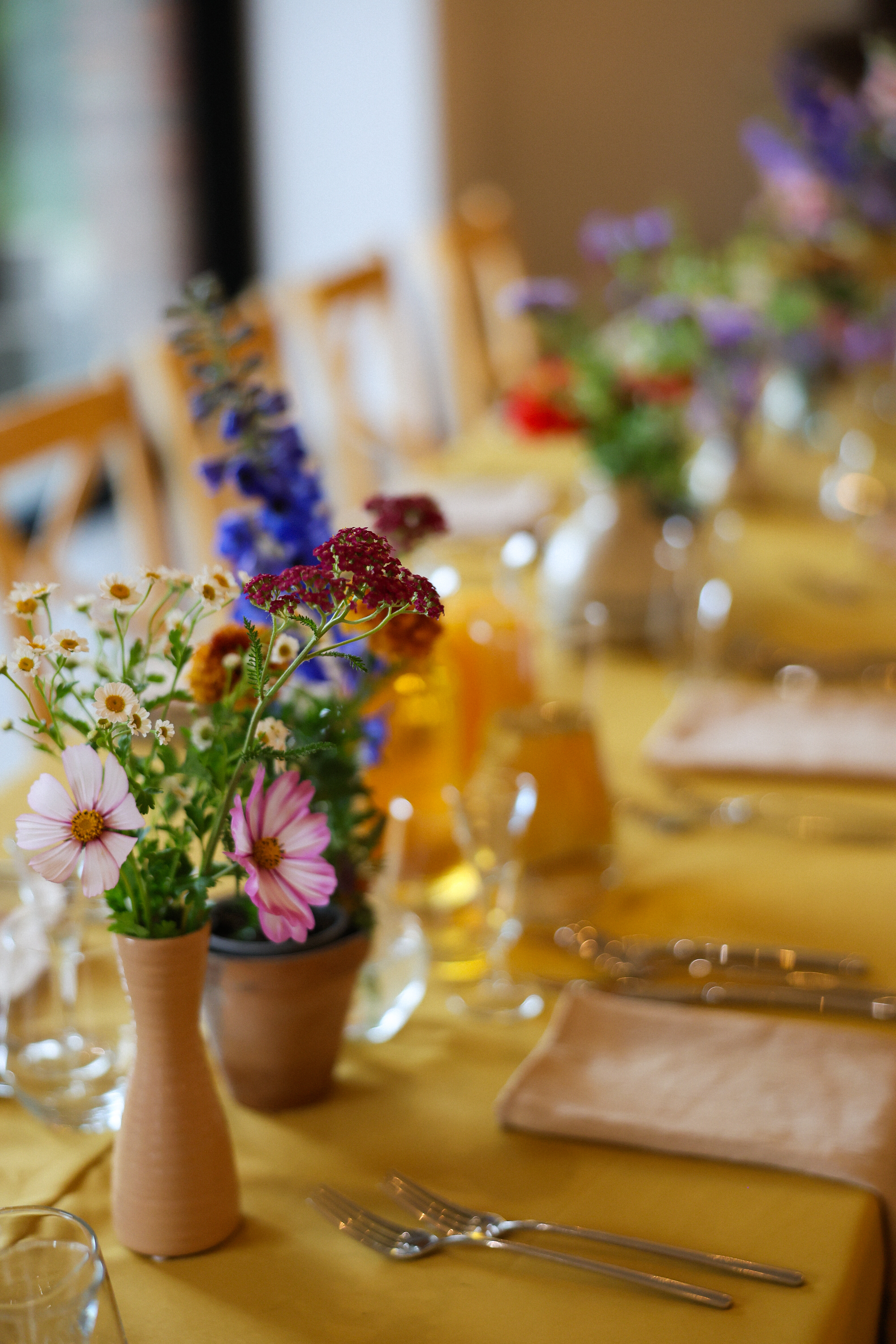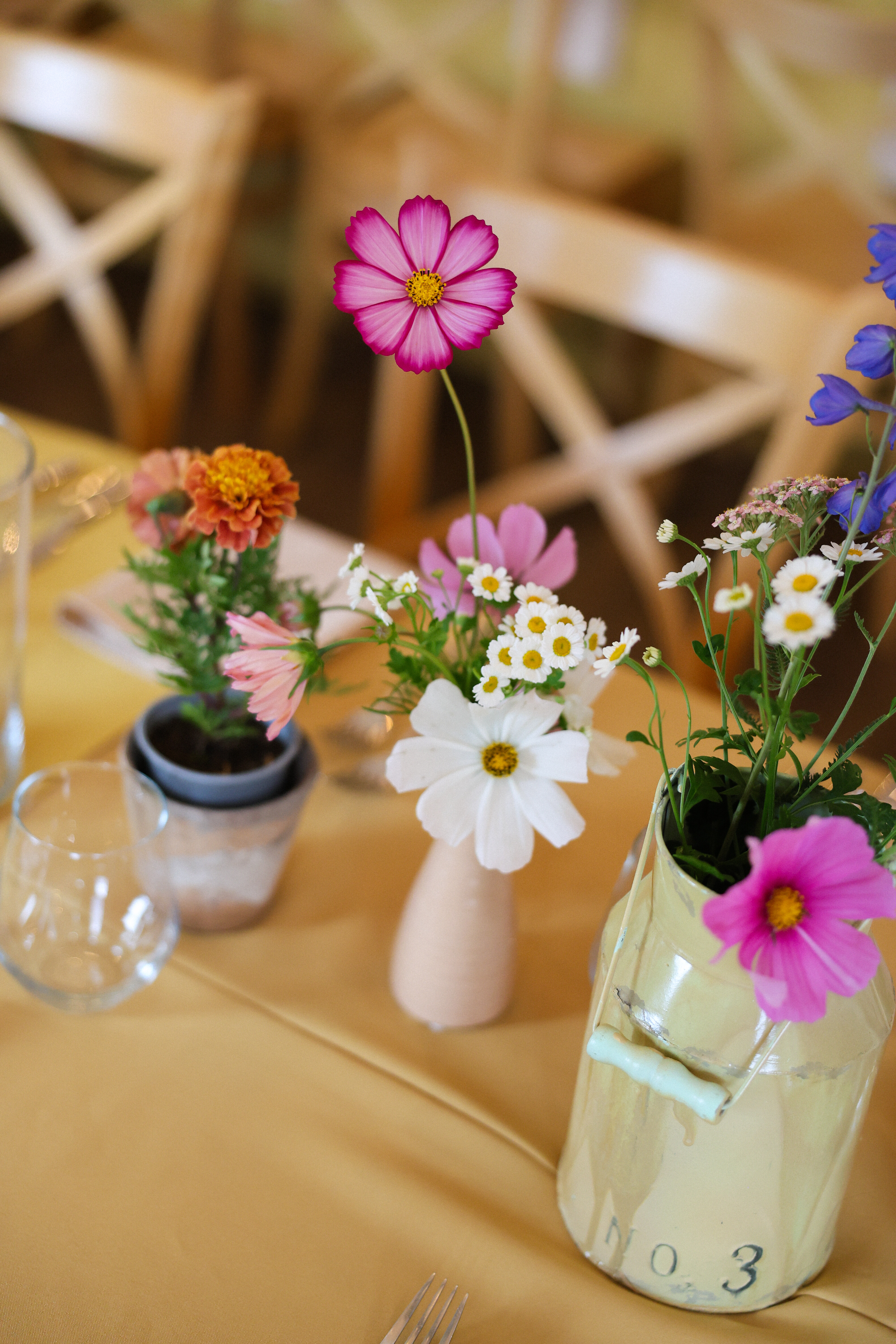 Plenerowy ślub Karo i Marcina odbył się na terenie Krainy Dzikiej Kaczki - wśród drzew, na tle ponad stuletniej futryny, którą ozdobiłyśmy wstążkami. Reszta dekoracji tego miejsca to inwencja twórcza właścicielki obiektu :) Poprzestawiała nasze dekoracje i zrobiła nam tym niezłego psikusa! Całokształt miał być utrzymany w sielskim, rustykalnym klimacie. Wykorzystałyśmy w aranżacjach stare kanki, terakotowe doniczki z kwiatami, które później zabrali nasi klienci. Mix ceramicznych i szklanych wazoników z wielokolorowymi kwiatami ozdobił stoły, które nakryłyśmy miodowymi obrusami.