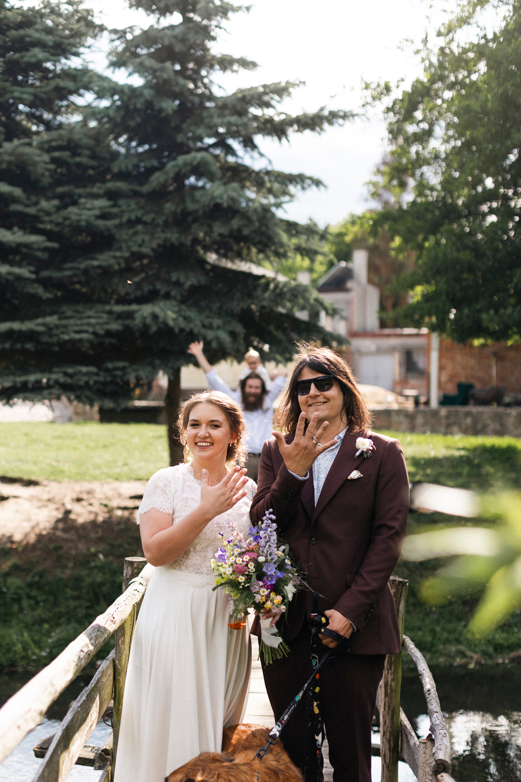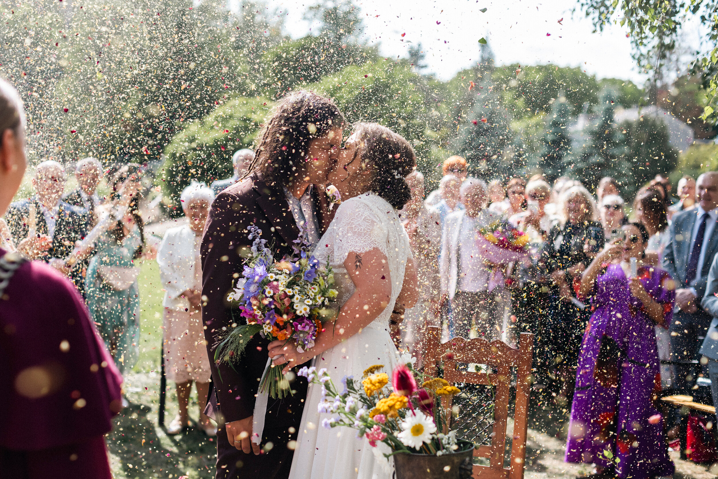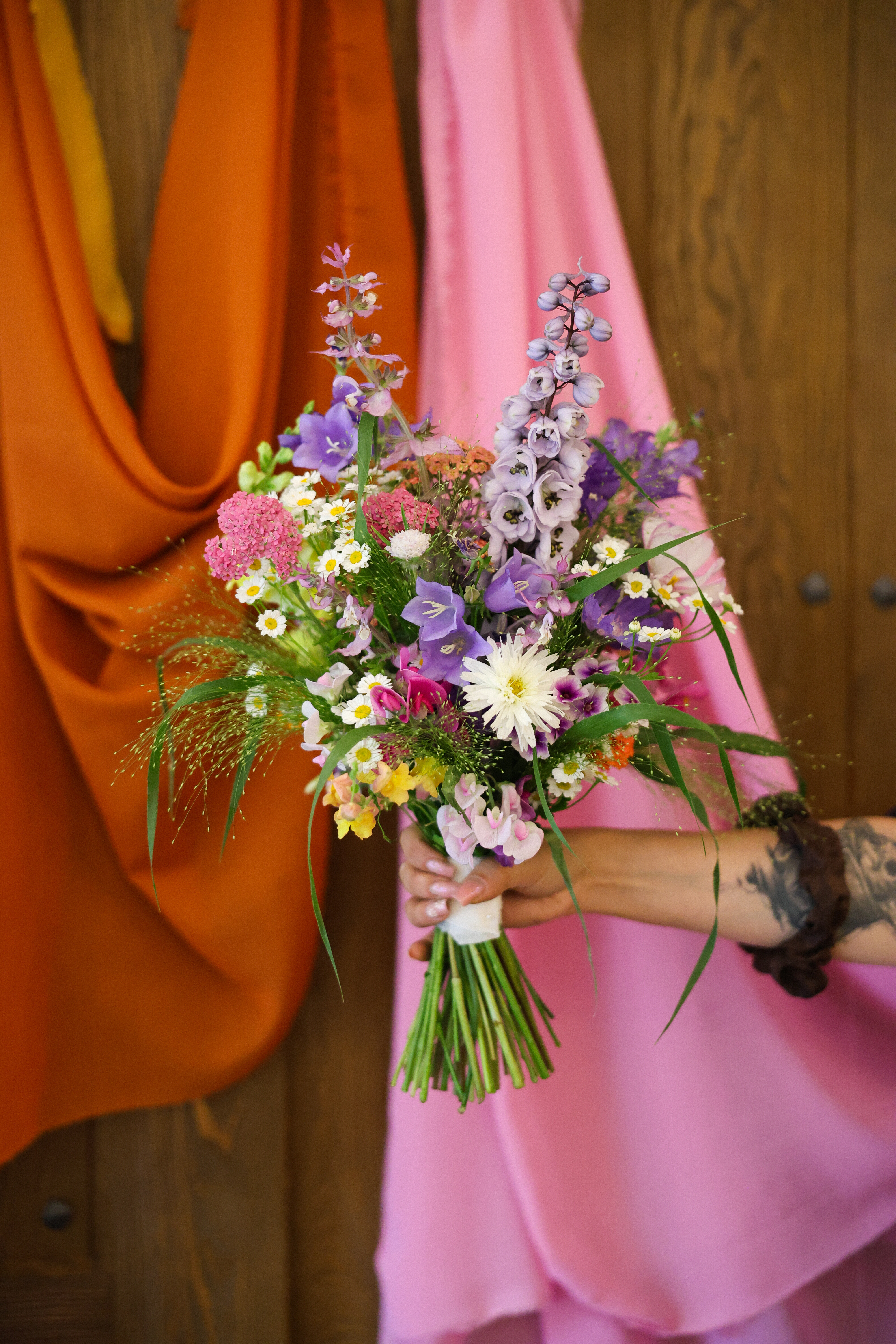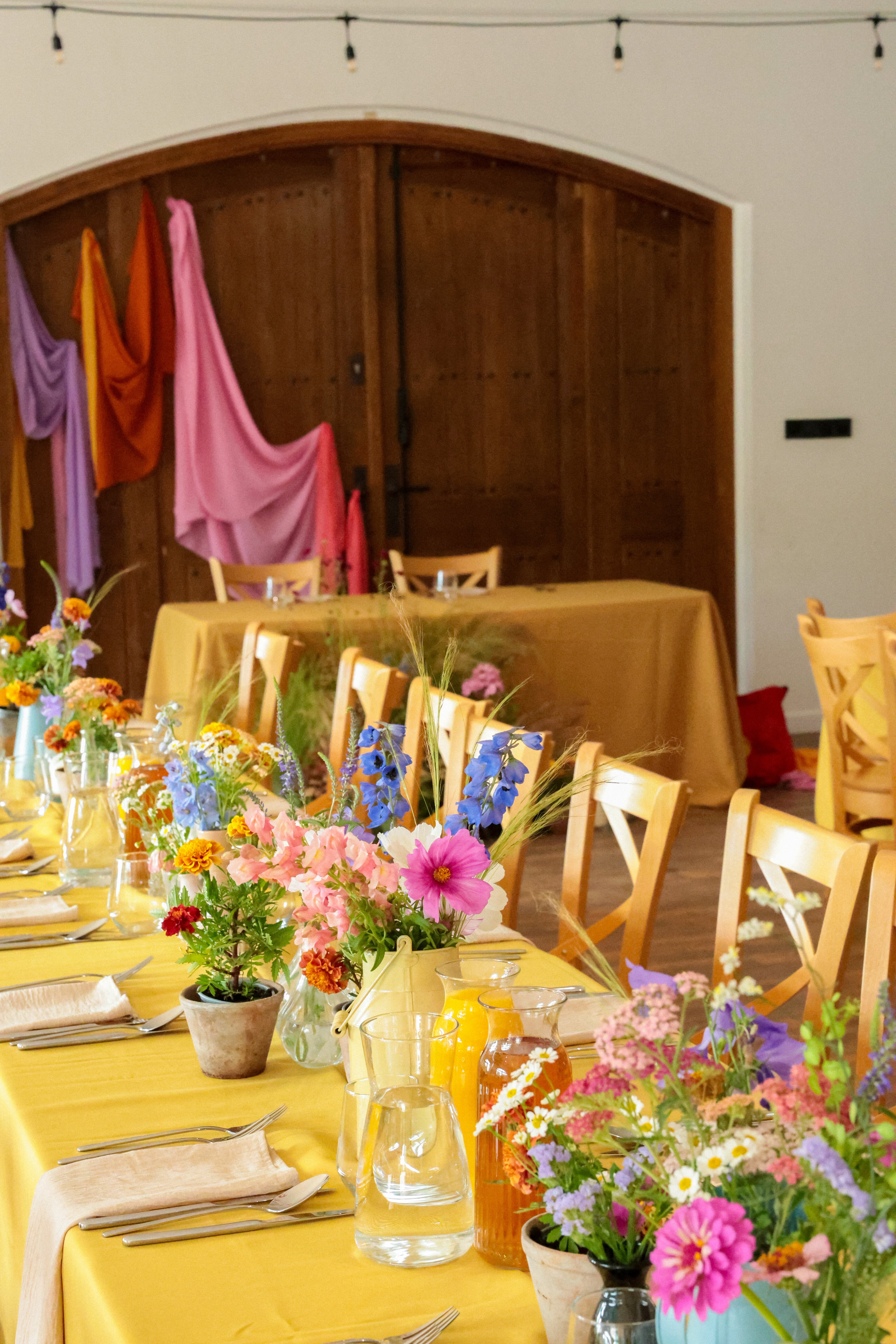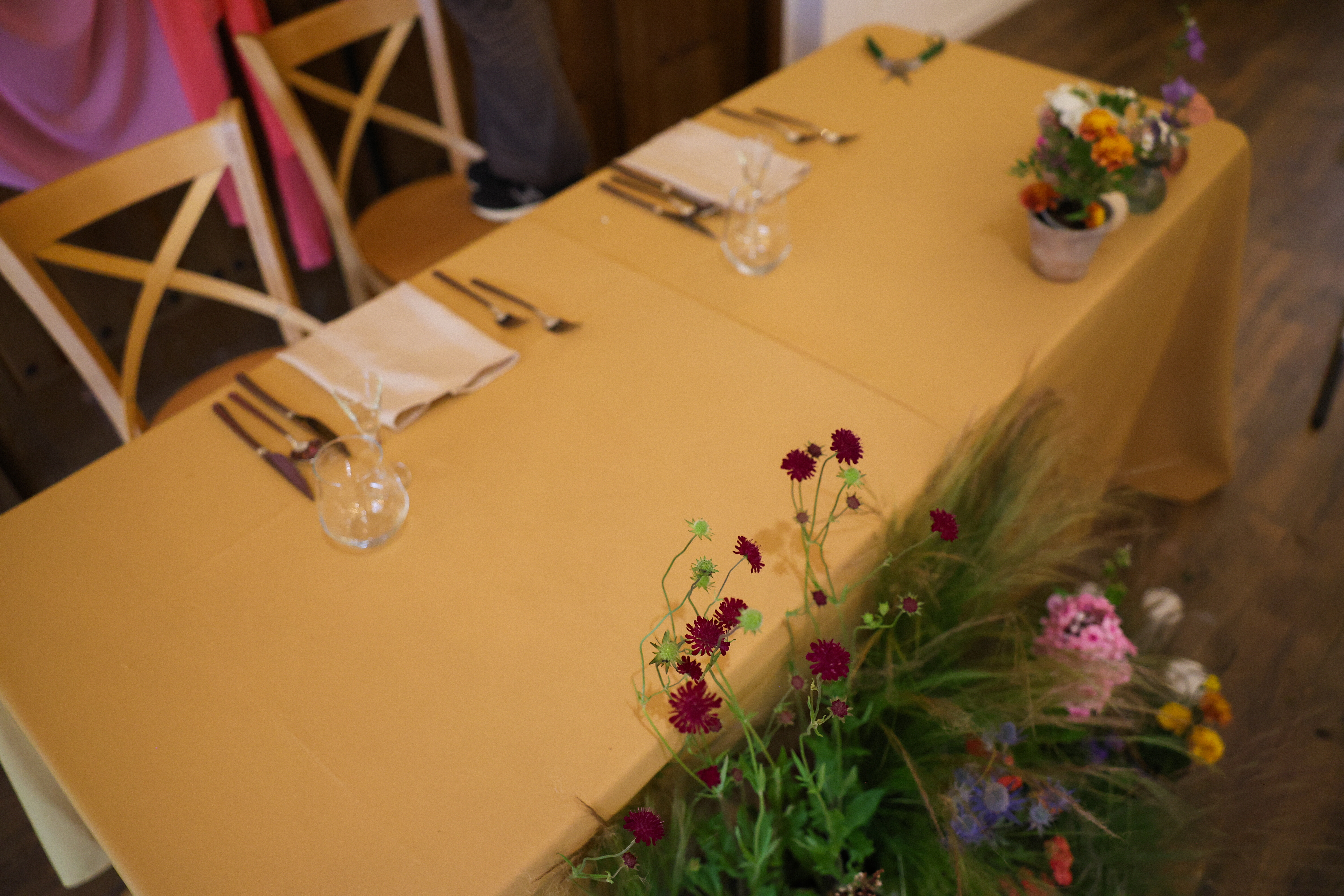 Plenerowy ślub Karo i Marcina odbył się na terenie Krainy Dzikiej Kaczki - wśród drzew, na tle ponad stuletniej futryny, którą ozdobiłyśmy wstążkami. Reszta dekoracji tego miejsca to inwencja twórcza właścicielki obiektu :) Poprzestawiała nasze dekoracje i zrobiła nam tym niezłego psikusa! Całokształt miał być utrzymany w sielskim, rustykalnym klimacie. Wykorzystałyśmy w aranżacjach stare kanki, terakotowe doniczki z kwiatami, które później zabrali nasi klienci. Mix ceramicznych i szklanych wazoników z wielokolorowymi kwiatami ozdobił stoły, które nakryłyśmy miodowymi obrusami.