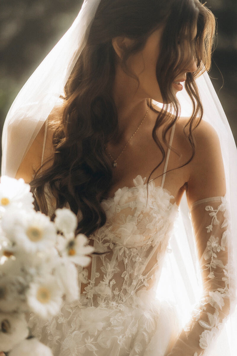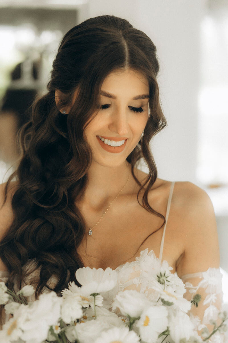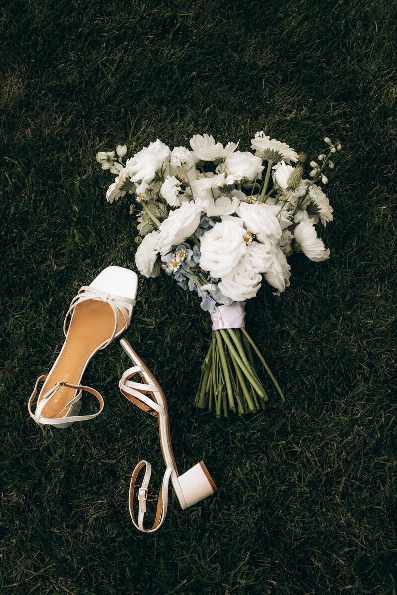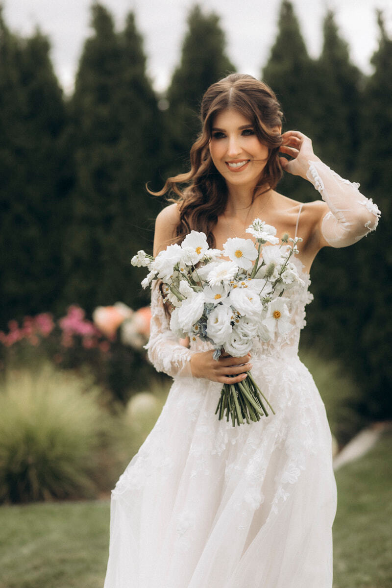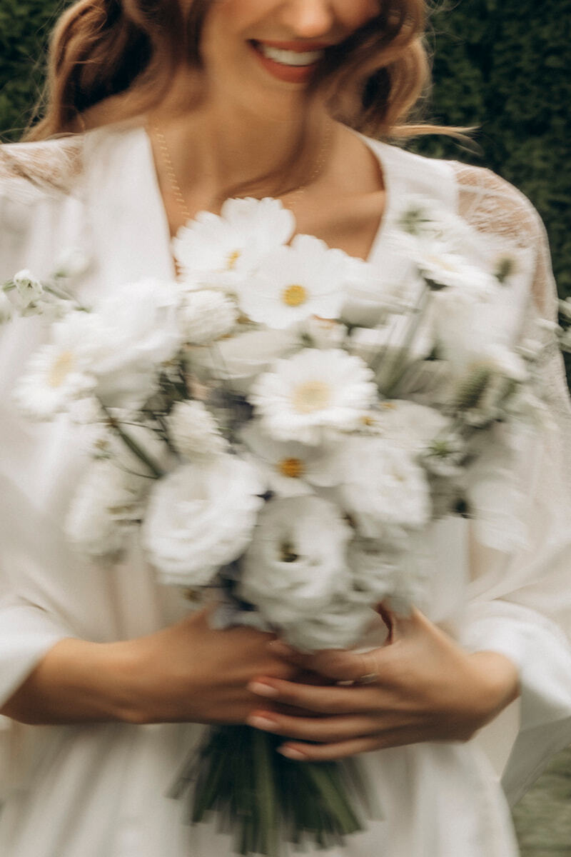 W aranżacji zostały użyte setki kosmosów w kolorze białym, błękitnych i białych ostróżek, hortensji oraz białe gerbery. Uzyskałyśmy efekt, na którym nam zależało - duża ilość kwiatów i liści przy jednoczesnym zachowaniu klasy i zwiewności :)