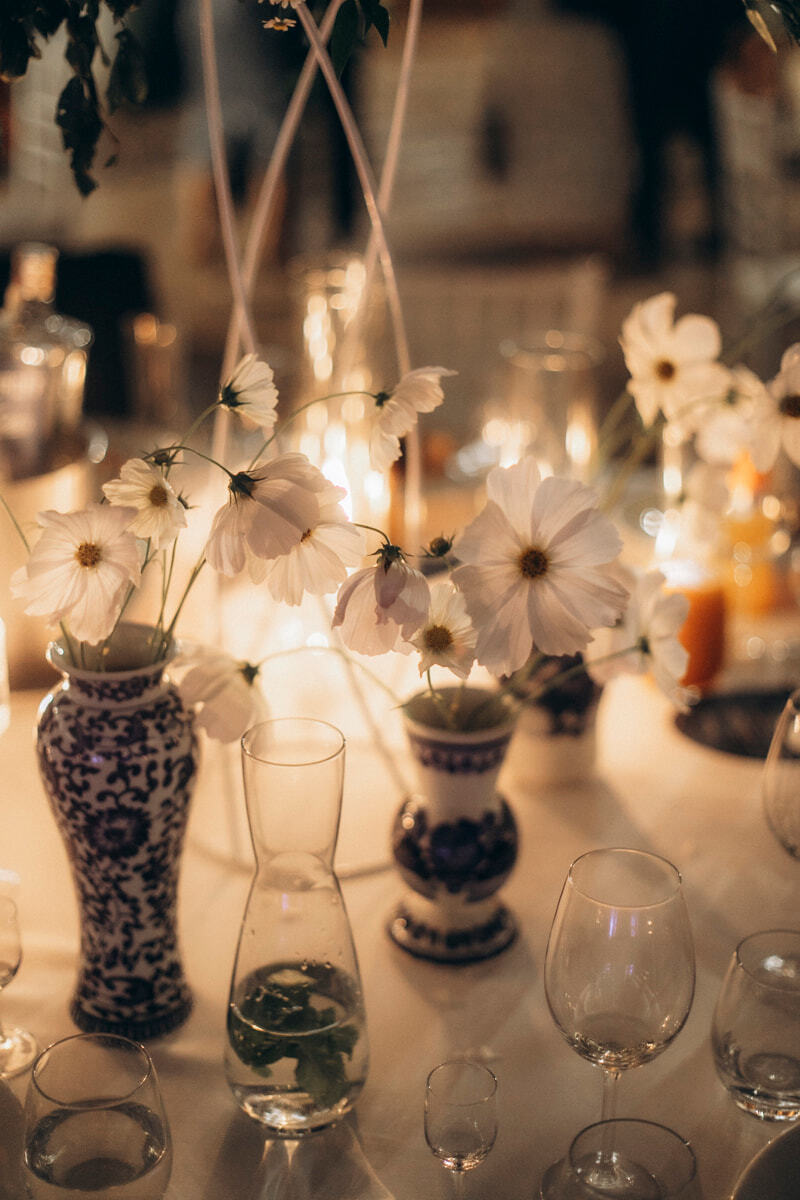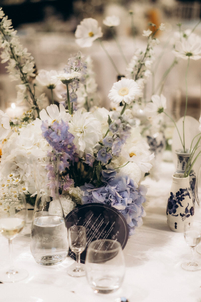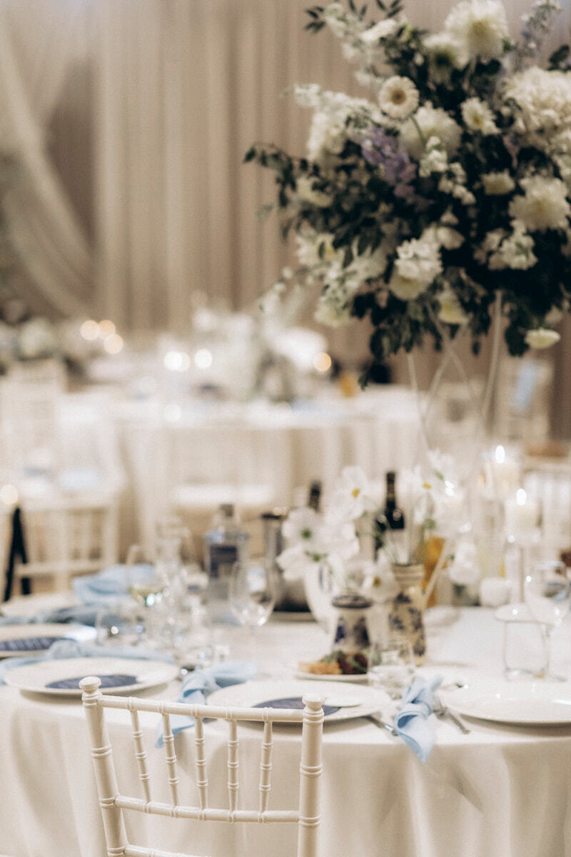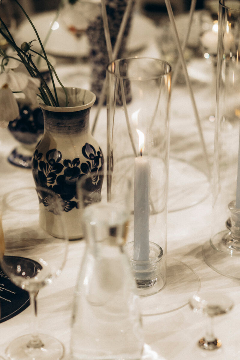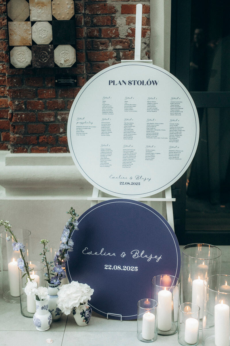 Wesele Eweliny i Błażeja to prawdziwa uczta estetyczna. Dekoracje w odcieniach bieli, błękitu i kobaltowe akcenty w papeterii oraz vintage ceramice spięły wszystko spójną klamrą. Na stołach pojawiły się miksy kompozycji oraz świeczników. Na połowie stołów zaplanowałam kompozycje wysokie na białych, delikatnych stojakach, a na drugiej połowie kompozycje niskie. Obydwa rodzaje dekoracji uzupełniłyśmy wazonami vintage z białymi kosmosami oraz błękitnymi ostróżkami. Na stołach pojawiły się świece stożkowe w błękicie oraz białe świece bryłowe w świecznikach na nóżkach. Za Parą stanęła rozbudowana ścianka kwiatowa, składająca się z dwóch stelaży oraz postumentów. We foyer ustawiłyśmy bogate kompozycje kwiatowe oraz dużą ilość świec w szklanych tubach. Całość dekoracji zmieniła swój charakter po zapaleniu świec - obejrzyj zdjęcia autorstwa Pauli Kalias <3