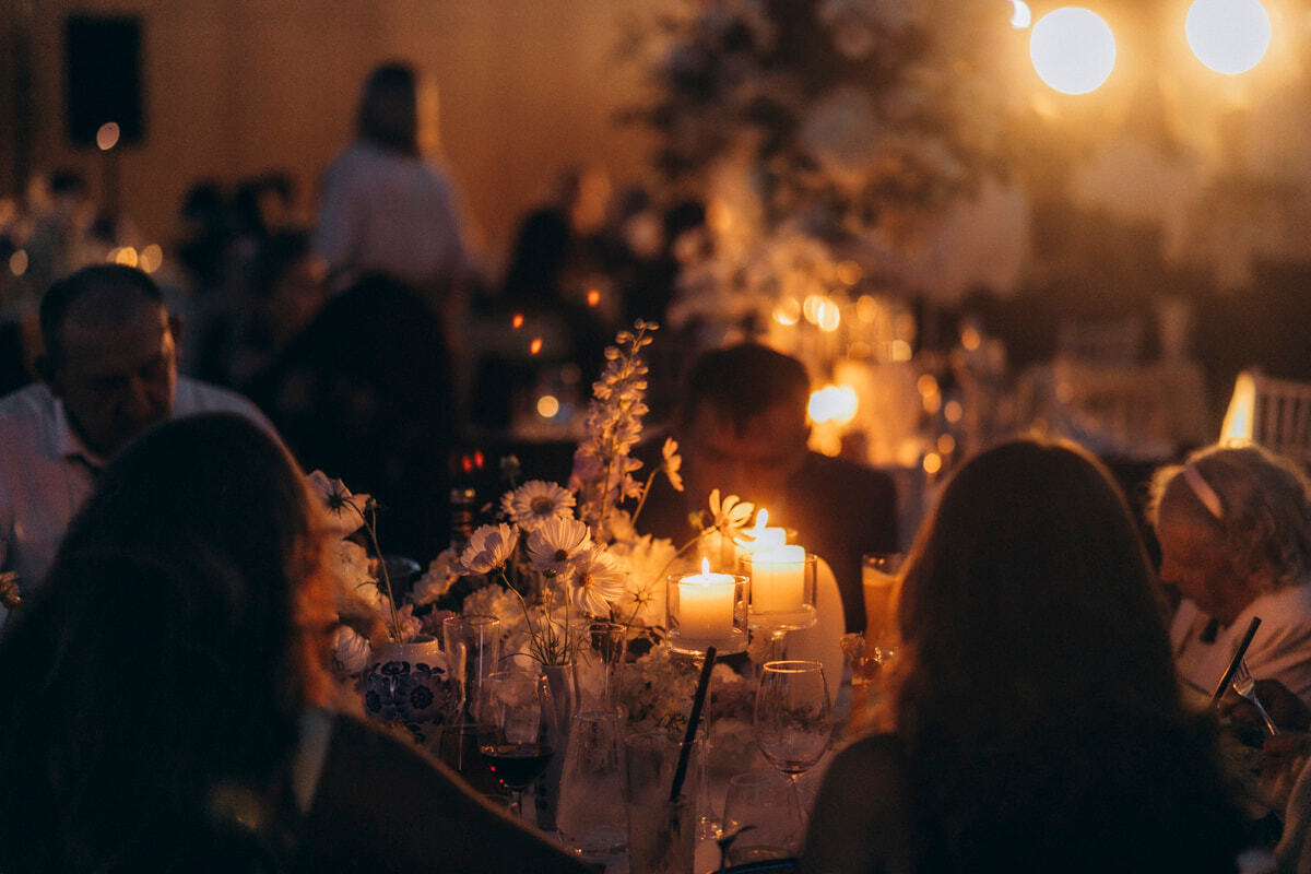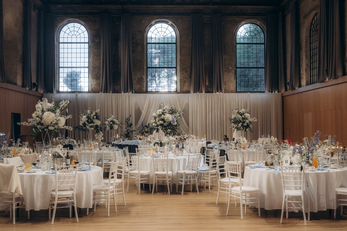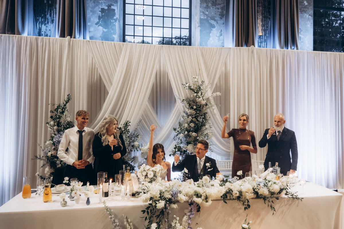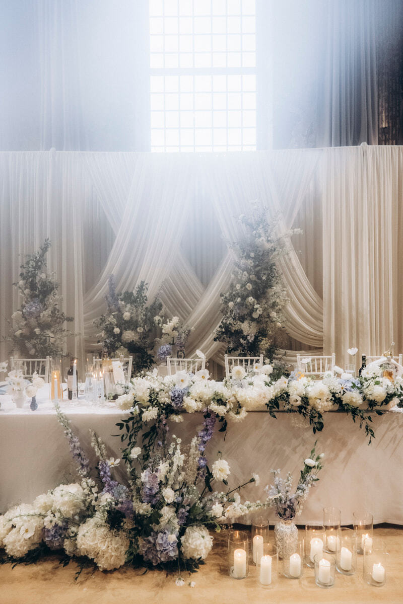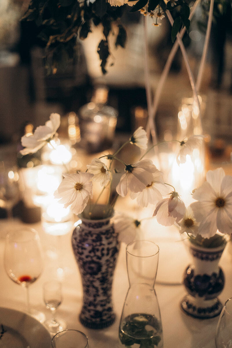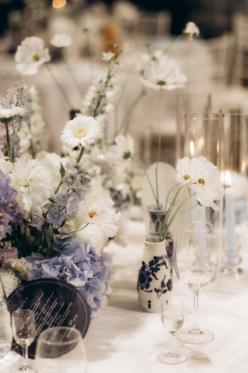 Wesele Eweliny i Błażeja to prawdziwa uczta estetyczna. Dekoracje w odcieniach bieli, błękitu i kobaltowe akcenty w papeterii oraz vintage ceramice spięły wszystko spójną klamrą. Na stołach pojawiły się miksy kompozycji oraz świeczników. Na połowie stołów zaplanowałam kompozycje wysokie na białych, delikatnych stojakach, a na drugiej połowie kompozycje niskie. Obydwa rodzaje dekoracji uzupełniłyśmy wazonami vintage z białymi kosmosami oraz błękitnymi ostróżkami. Na stołach pojawiły się świece stożkowe w błękicie oraz białe świece bryłowe w świecznikach na nóżkach. Za Parą stanęła rozbudowana ścianka kwiatowa, składająca się z dwóch stelaży oraz postumentów. We foyer ustawiłyśmy bogate kompozycje kwiatowe oraz dużą ilość świec w szklanych tubach. Całość dekoracji zmieniła swój charakter po zapaleniu świec - obejrzyj zdjęcia autorstwa Pauli Kalias <3