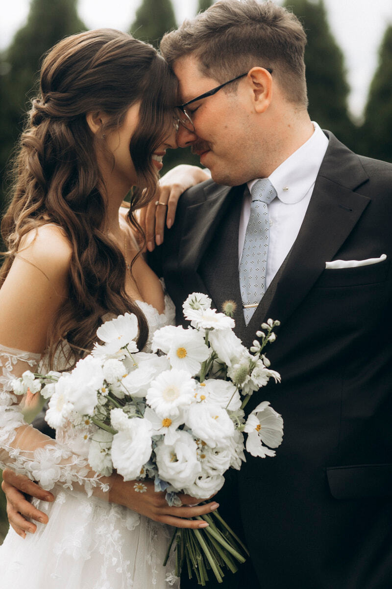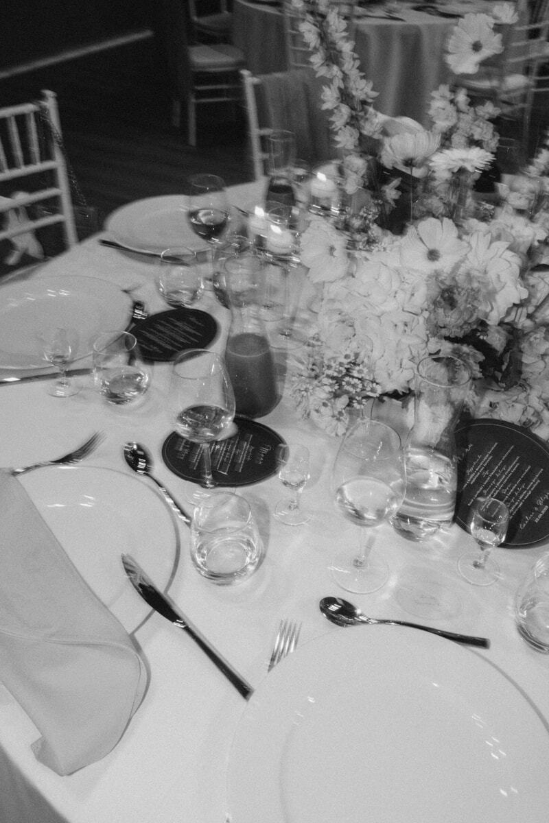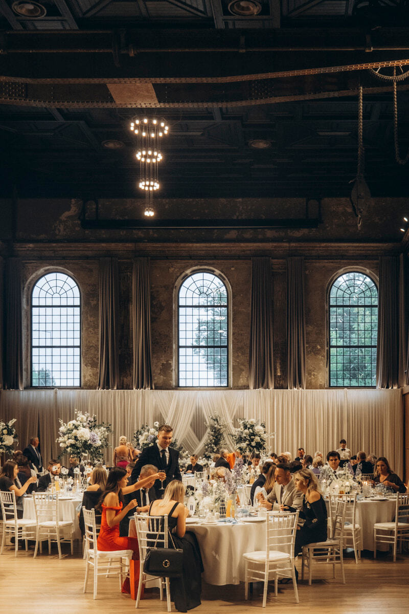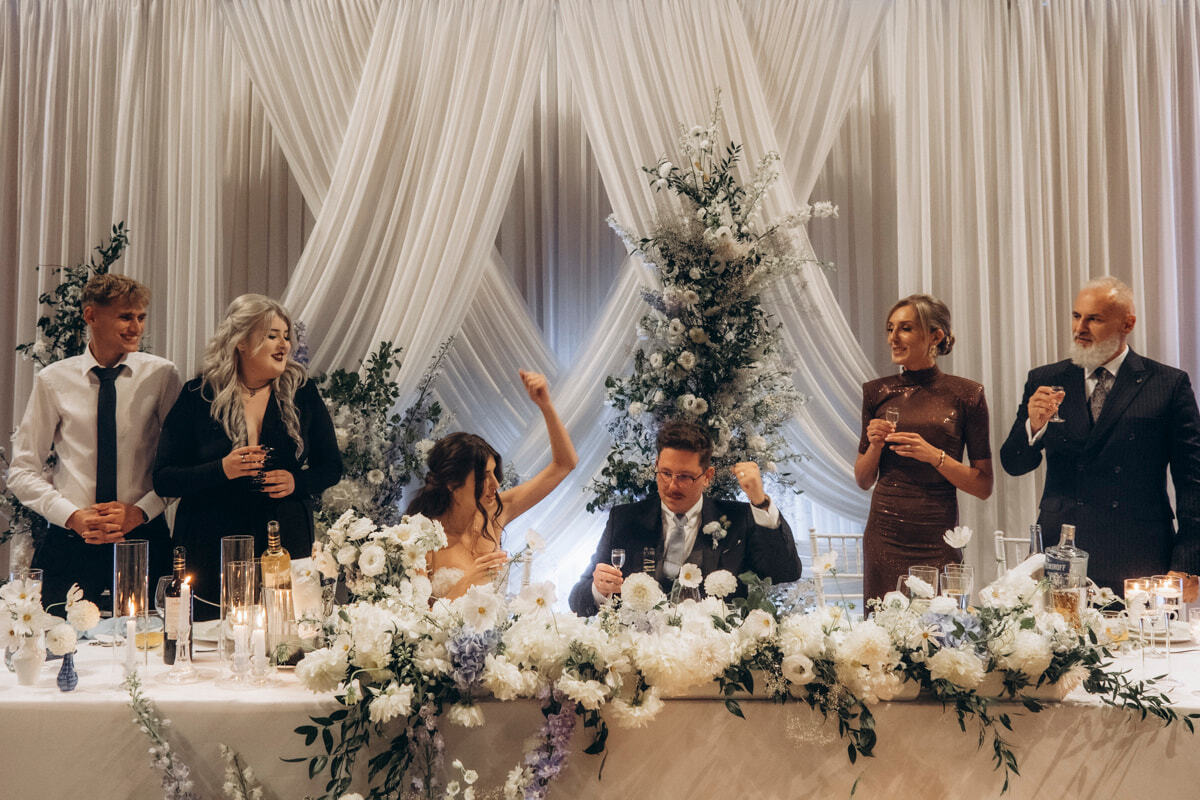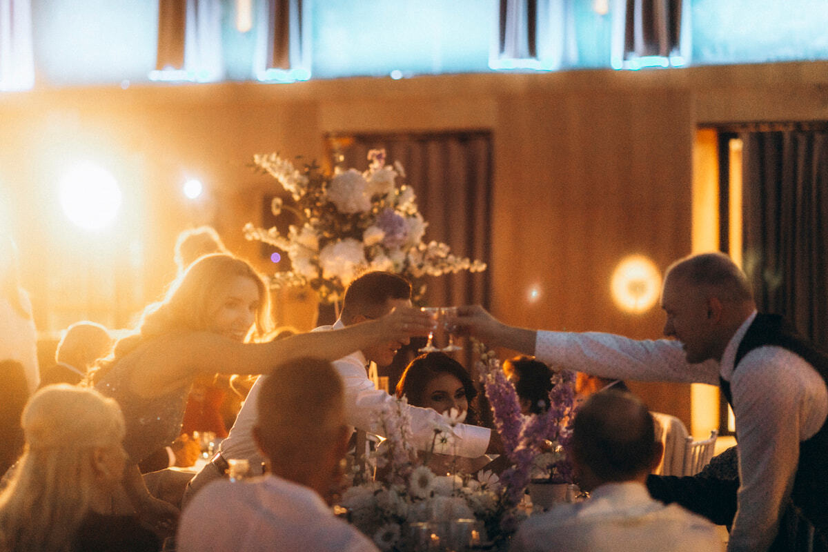 Wesele Eweliny i Błażeja to prawdziwa uczta estetyczna. Dekoracje w odcieniach bieli, błękitu i kobaltowe akcenty w papeterii oraz vintage ceramice spięły wszystko spójną klamrą. Na stołach pojawiły się miksy kompozycji oraz świeczników. Na połowie stołów zaplanowałam kompozycje wysokie na białych, delikatnych stojakach, a na drugiej połowie kompozycje niskie. Obydwa rodzaje dekoracji uzupełniłyśmy wazonami vintage z białymi kosmosami oraz błękitnymi ostróżkami. Na stołach pojawiły się świece stożkowe w błękicie oraz białe świece bryłowe w świecznikach na nóżkach. Za Parą stanęła rozbudowana ścianka kwiatowa, składająca się z dwóch stelaży oraz postumentów. We foyer ustawiłyśmy bogate kompozycje kwiatowe oraz dużą ilość świec w szklanych tubach. Całość dekoracji zmieniła swój charakter po zapaleniu świec - obejrzyj zdjęcia autorstwa Pauli Kalias <3