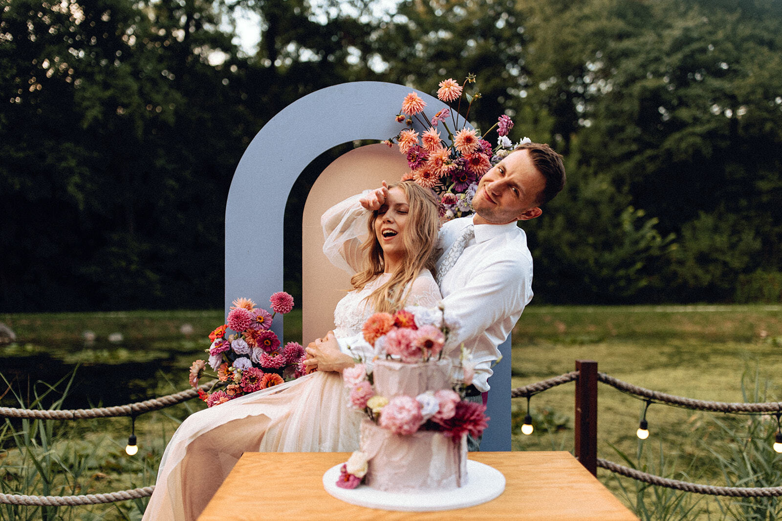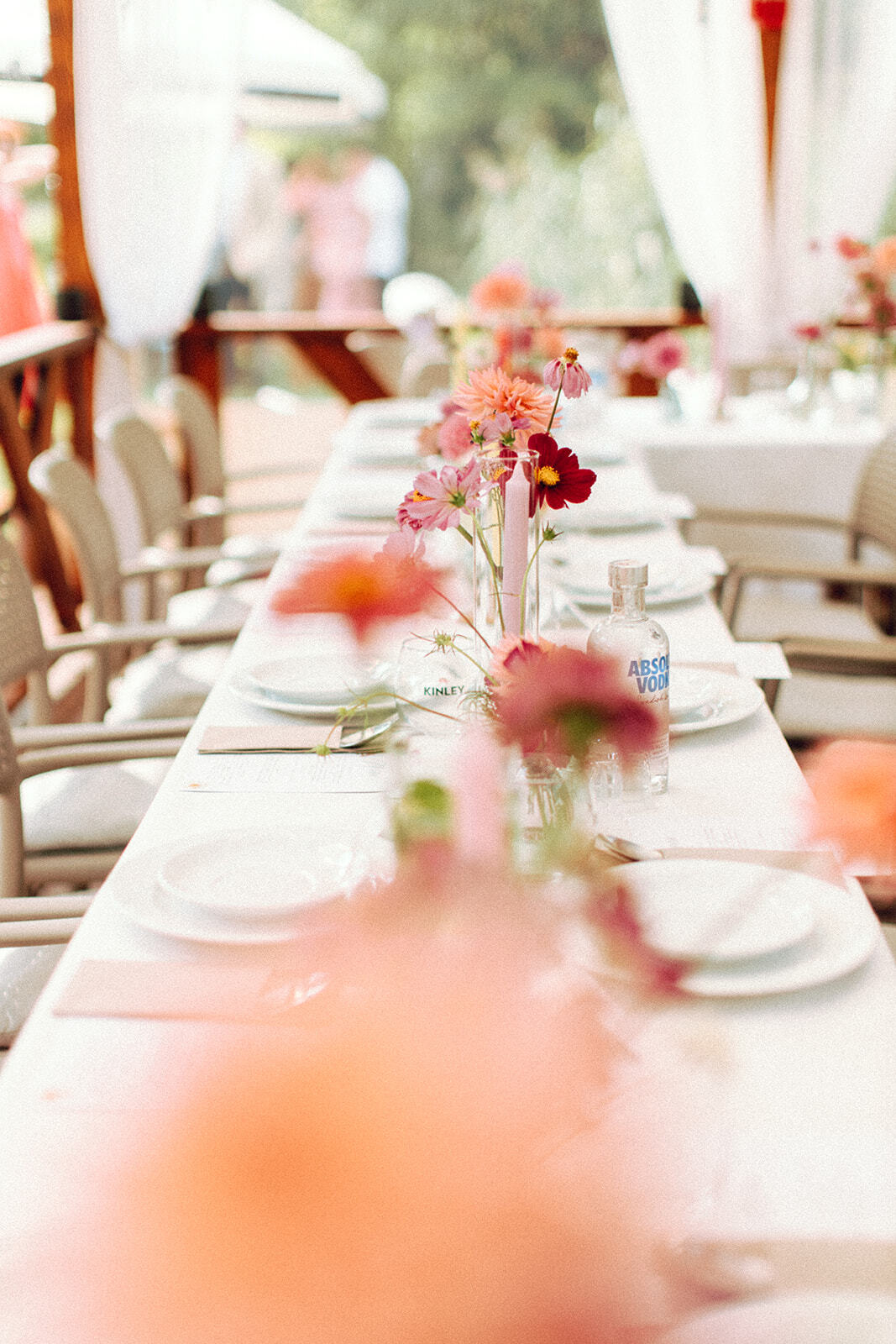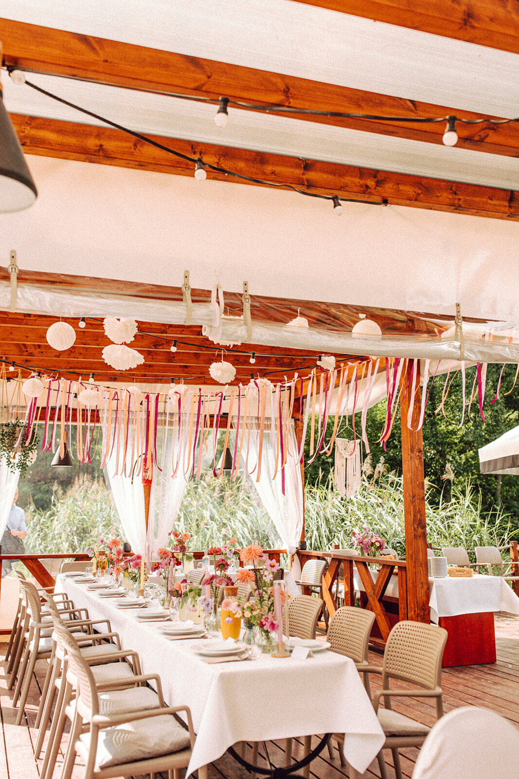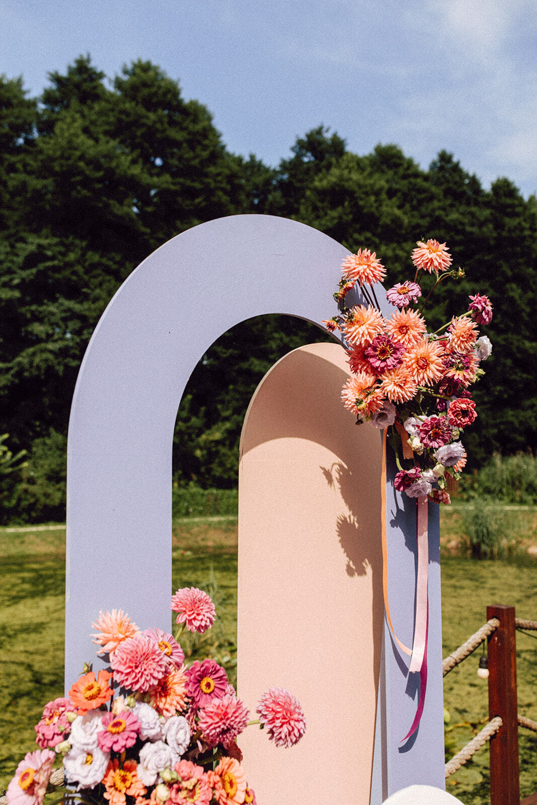 Klaudia i Kuba zdecydowali się na plenerowy ślub na tarasie w Stacji Skoszewy oraz drewnianą modułową ściankę pomalowaną w wybrane przez nich kolory - lawendowy oraz morelowy. Na ściance znalazły się dwie kwiatowe kompozycje bez udziału zieleni - eksplozja koloru :) Na stołach gości umieściłyśmy proste buteleczki z kwiatami. Fot. Jak w Bajce