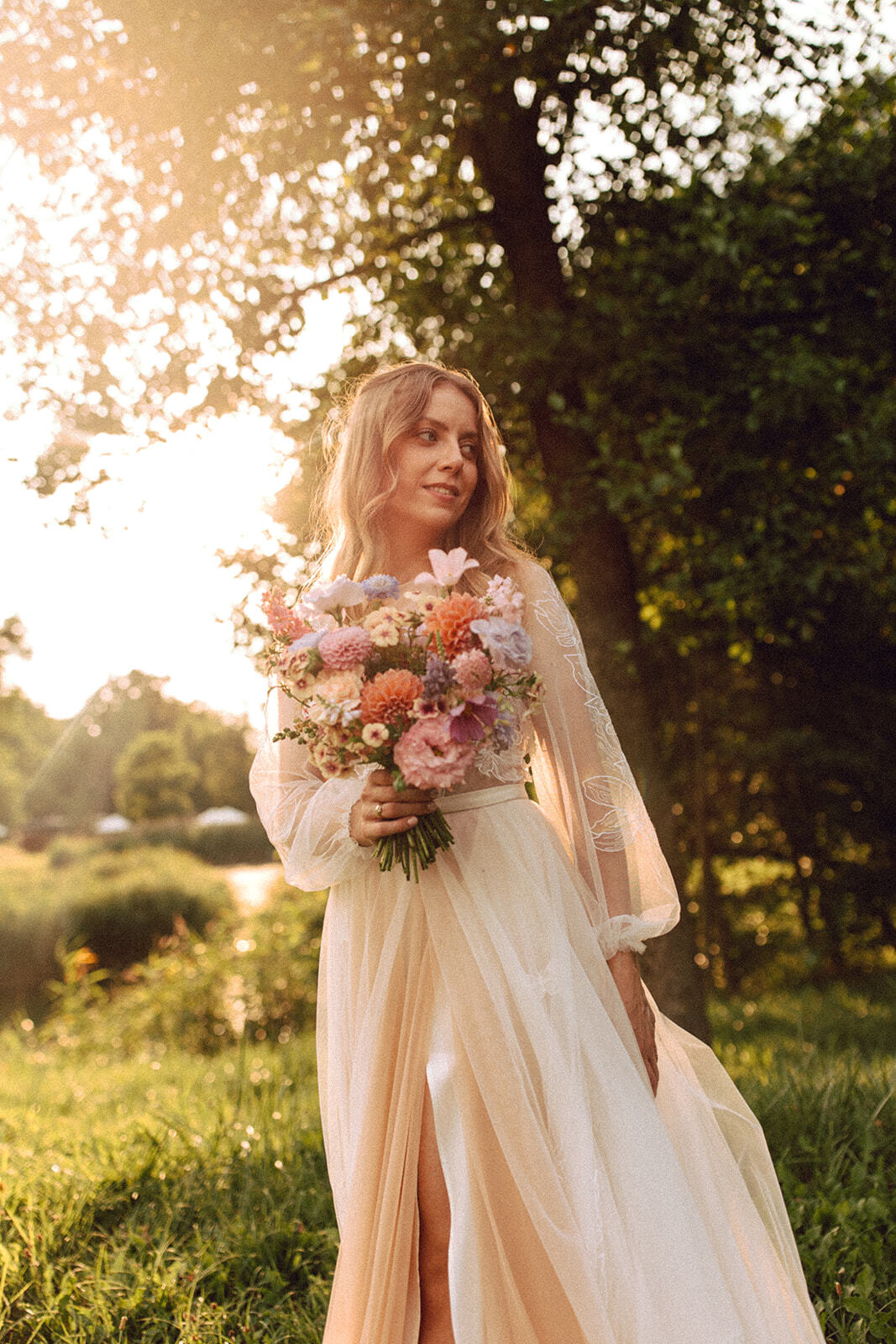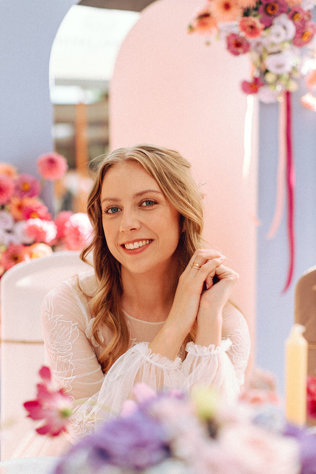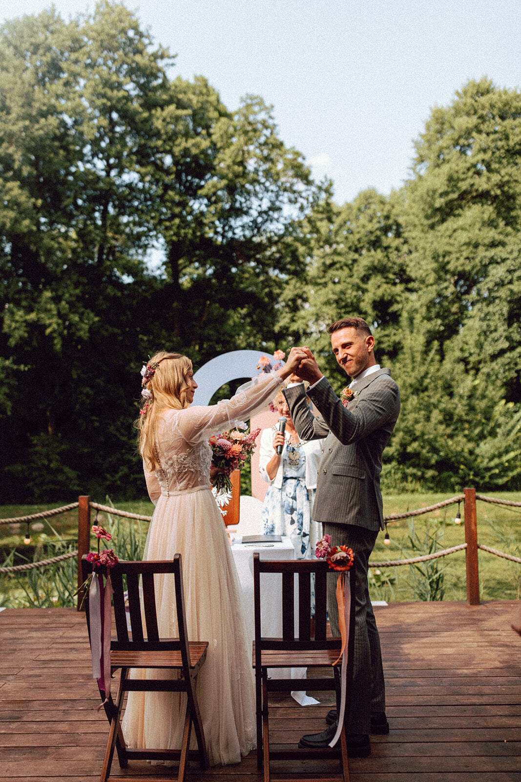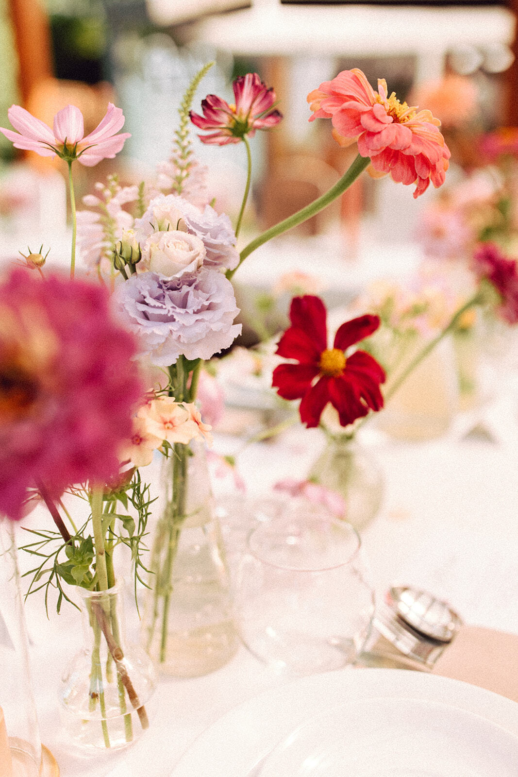 Klaudia i Kuba zdecydowali się na plenerowy ślub na tarasie w Stacji Skoszewy oraz drewnianą modułową ściankę pomalowaną w wybrane przez nich kolory - lawendowy oraz morelowy. Na ściance znalazły się dwie kwiatowe kompozycje bez udziału zieleni - eksplozja koloru :) Na stołach gości umieściłyśmy proste buteleczki z kwiatami. Fot. Jak w Bajce