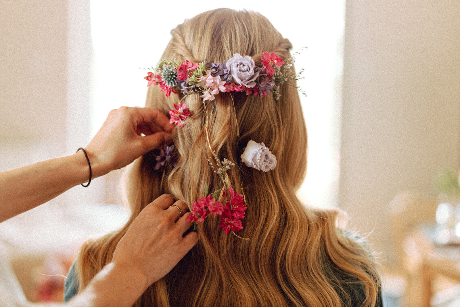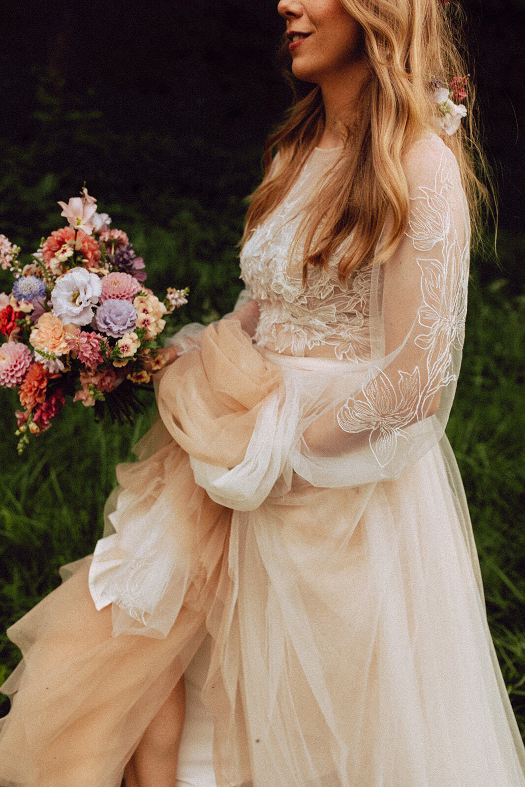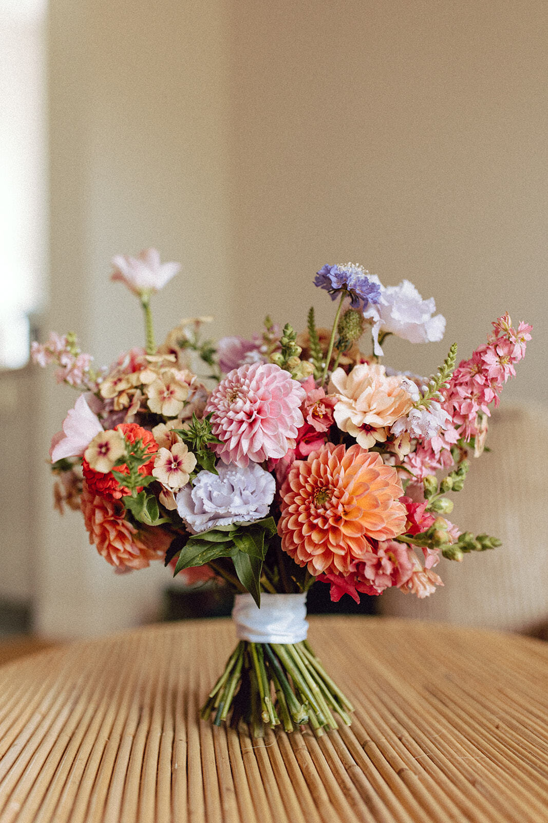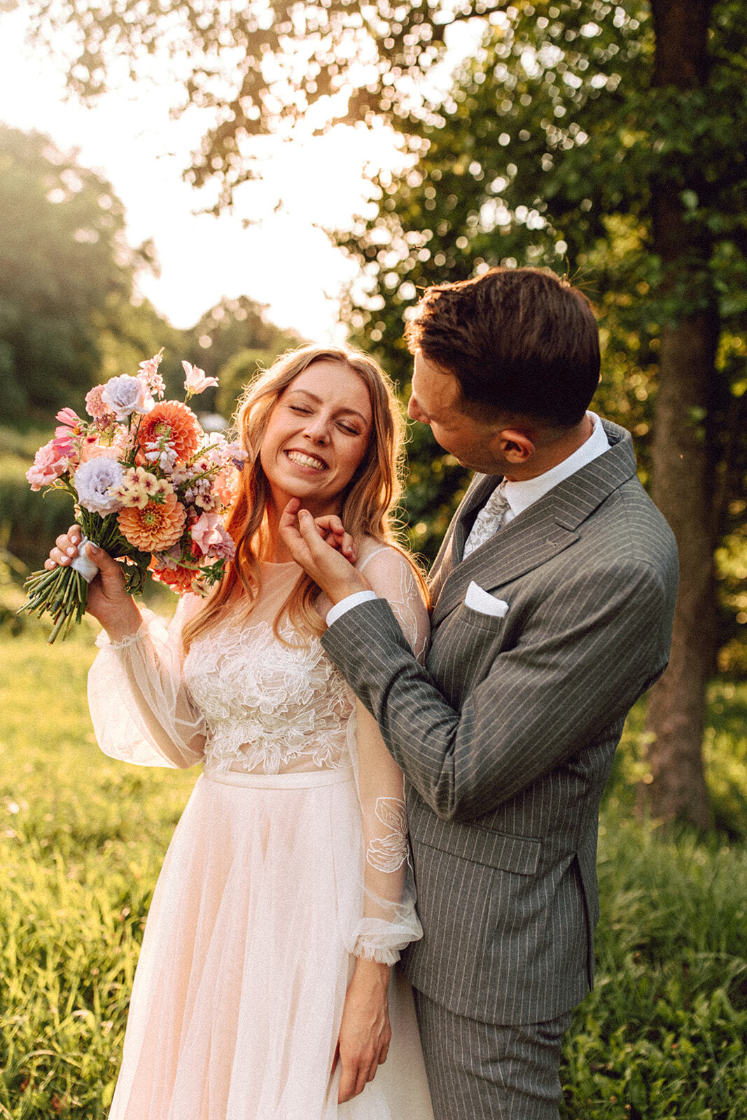 Klaudia i Kuba zdecydowali się na plenerowy ślub na tarasie w Stacji Skoszewy oraz drewnianą modułową ściankę pomalowaną w wybrane przez nich kolory - lawendowy oraz morelowy. Na ściance znalazły się dwie kwiatowe kompozycje bez udziału zieleni - eksplozja koloru :) Na stołach gości umieściłyśmy proste buteleczki z kwiatami. Fot. Jak w Bajce
