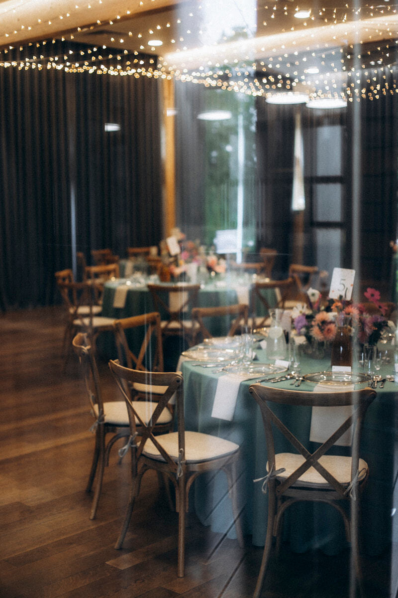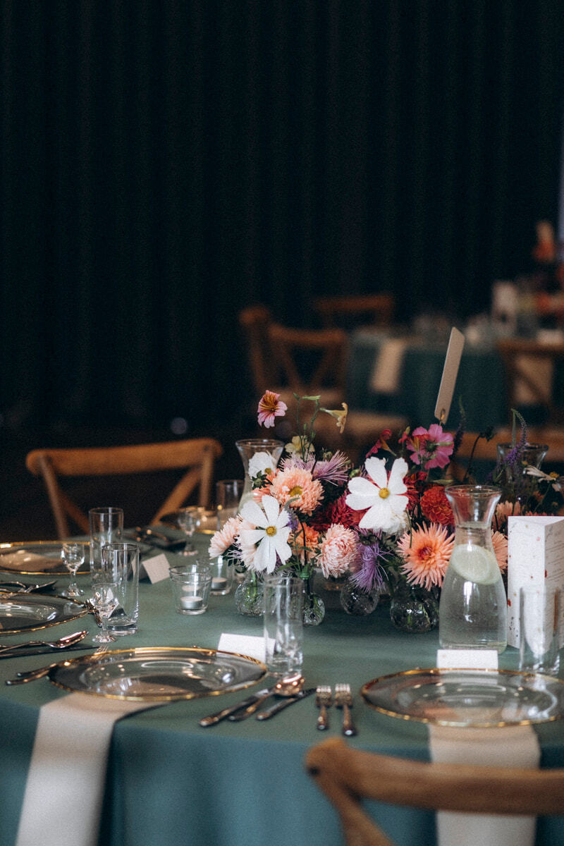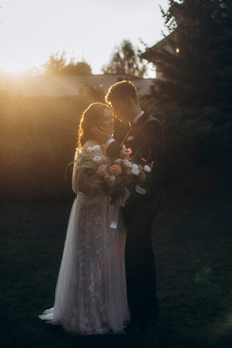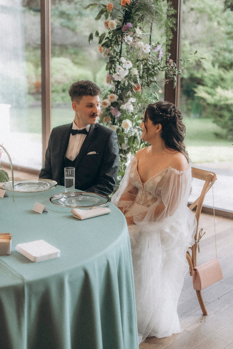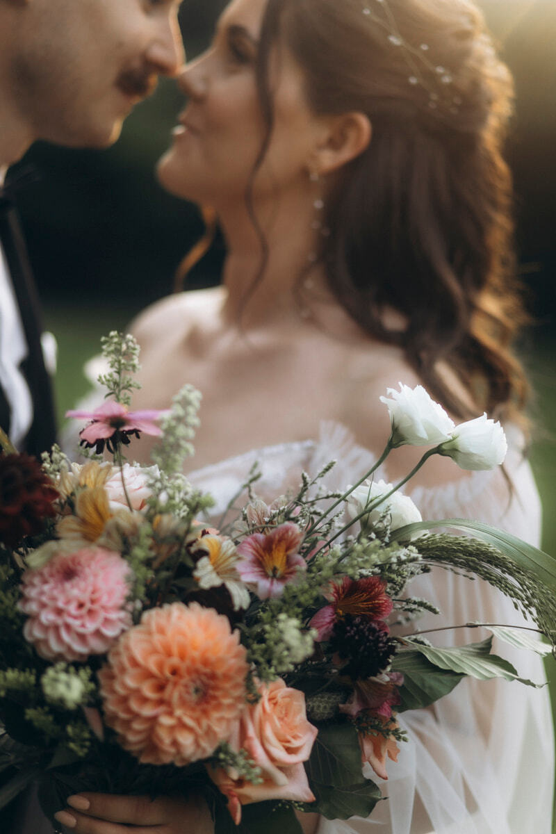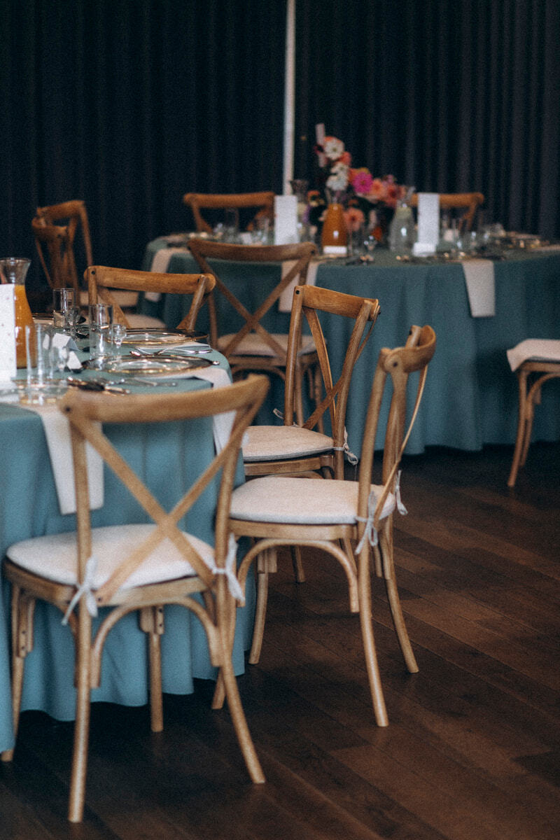 Dla Oli i Jakuba wypożyczyłam drewniane krzesła boho, które przyjechały aż z okolic Krakowa :) Do tego kremowe serwety i szałwiowe obrusy. Na stołach stanęły kompozycje z sezonowych, sierpniowych kwiatów w odcieniach różu, bieli, żółci, pomarańczu i bordo. Całości dopełniły szklane podtalerze ze złotymi rantami. Za stołem Pary Młodej stanęła piękna pergola kwiatowa w pastelowych odcieniach :)