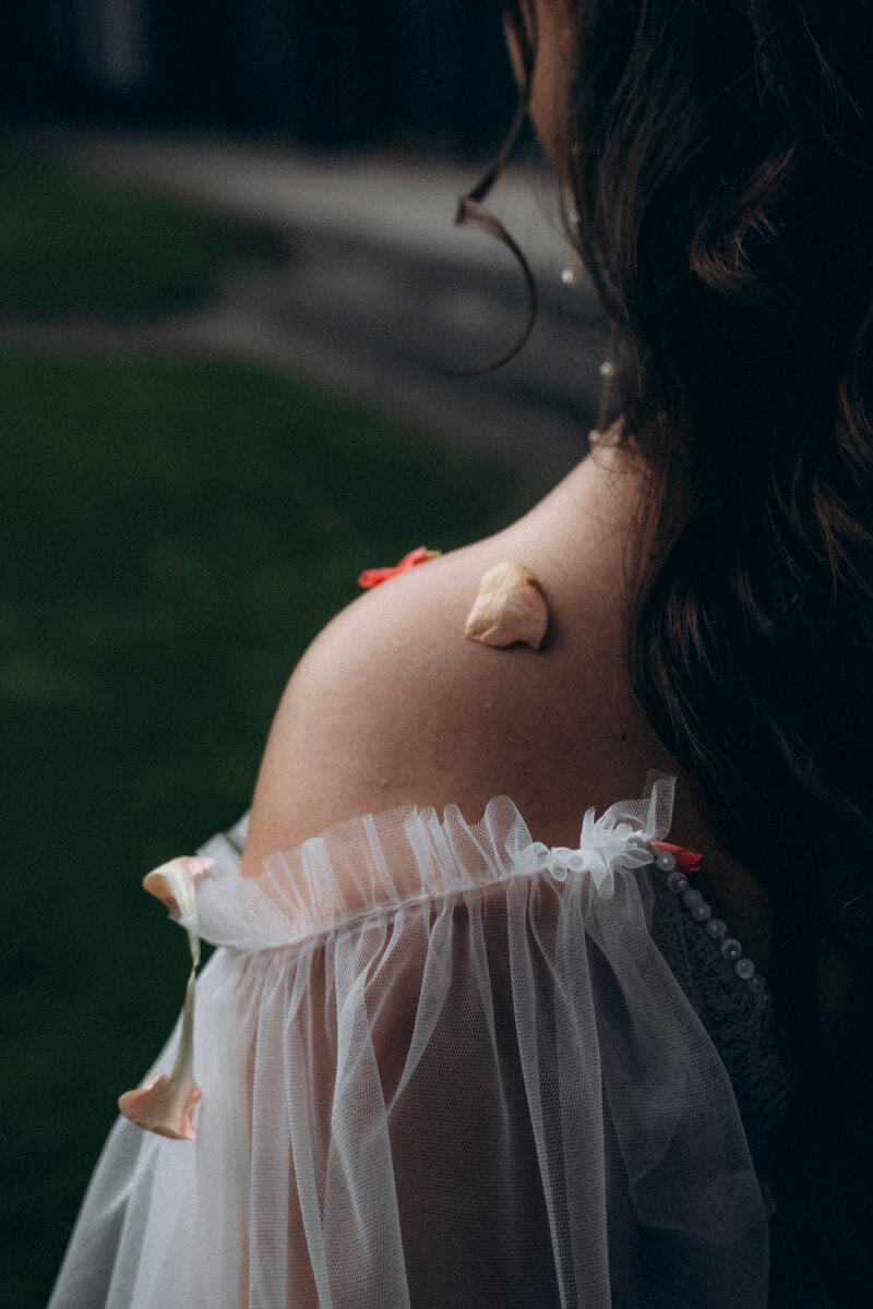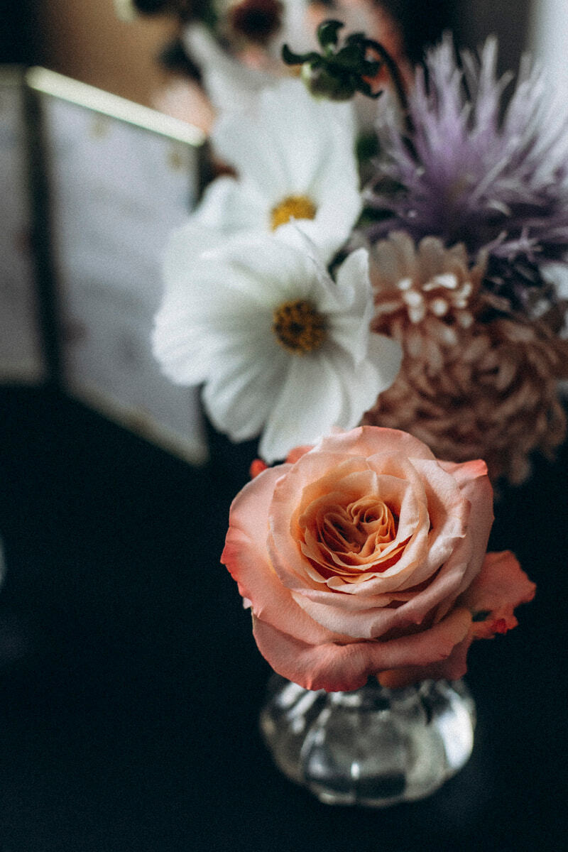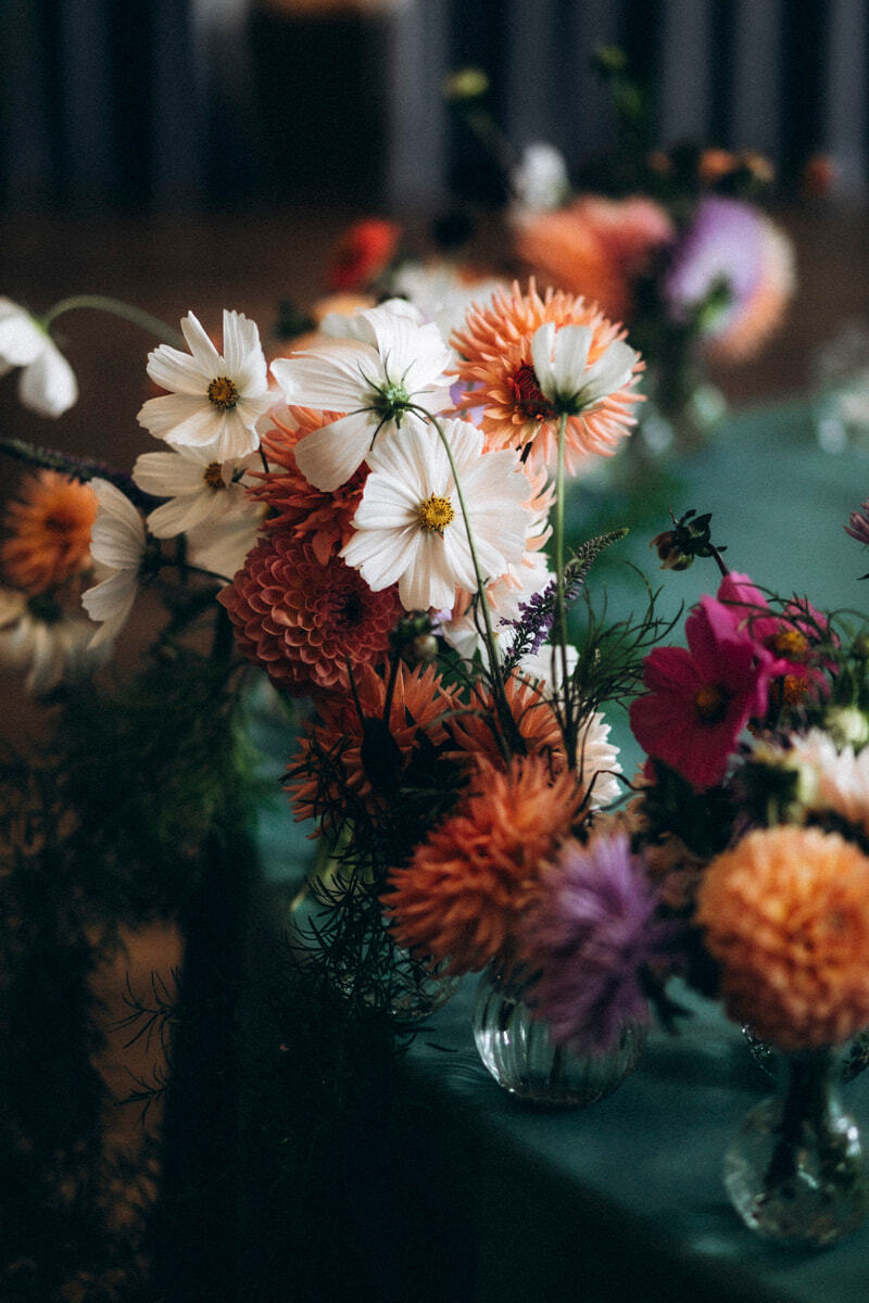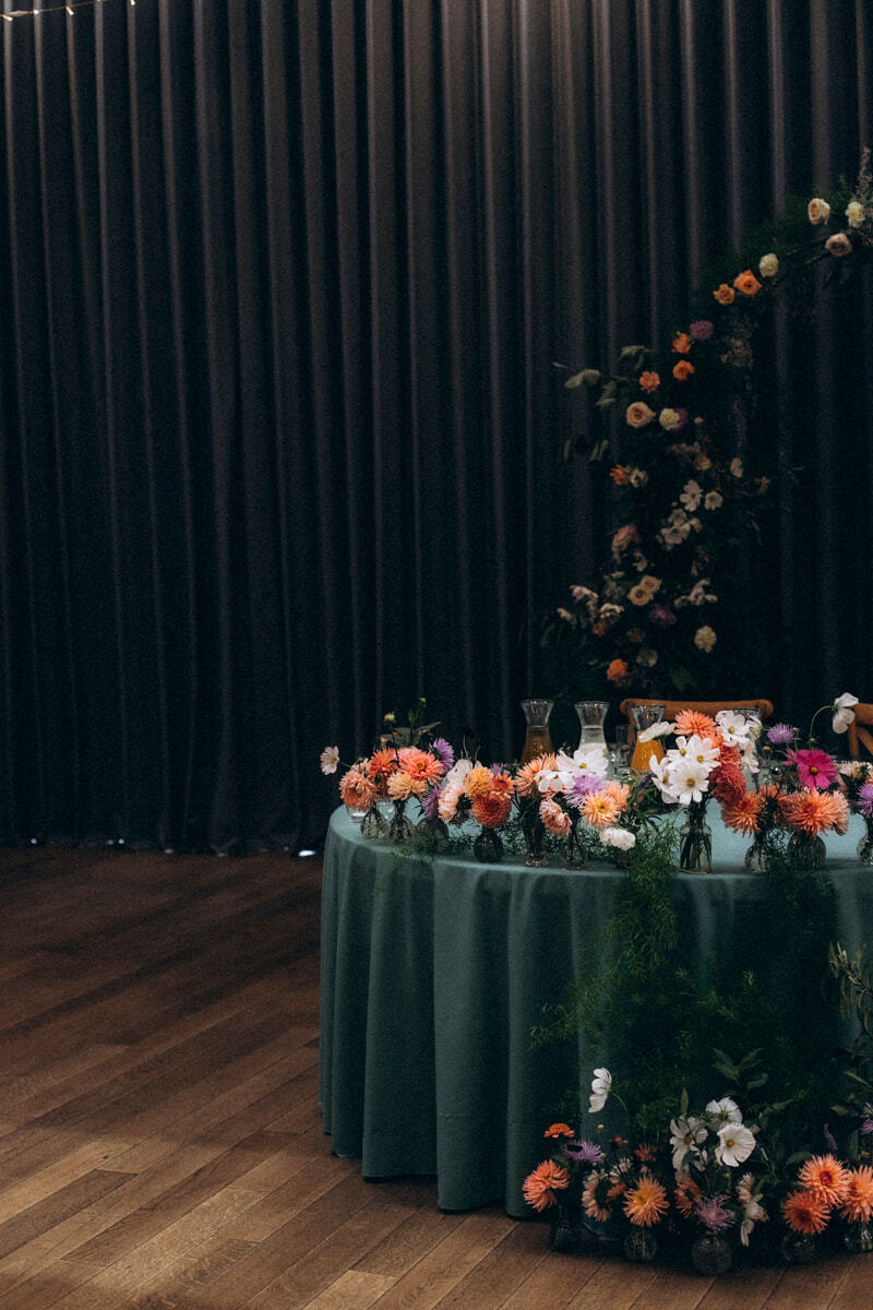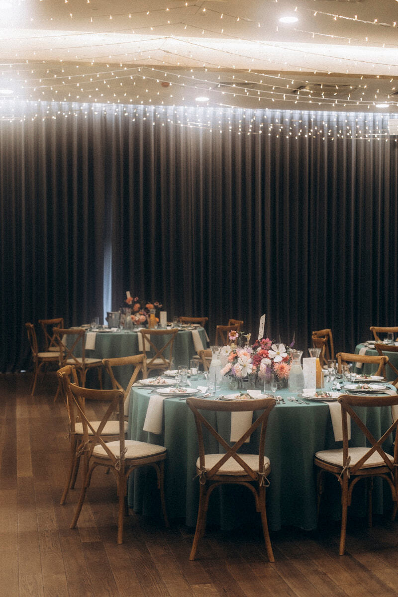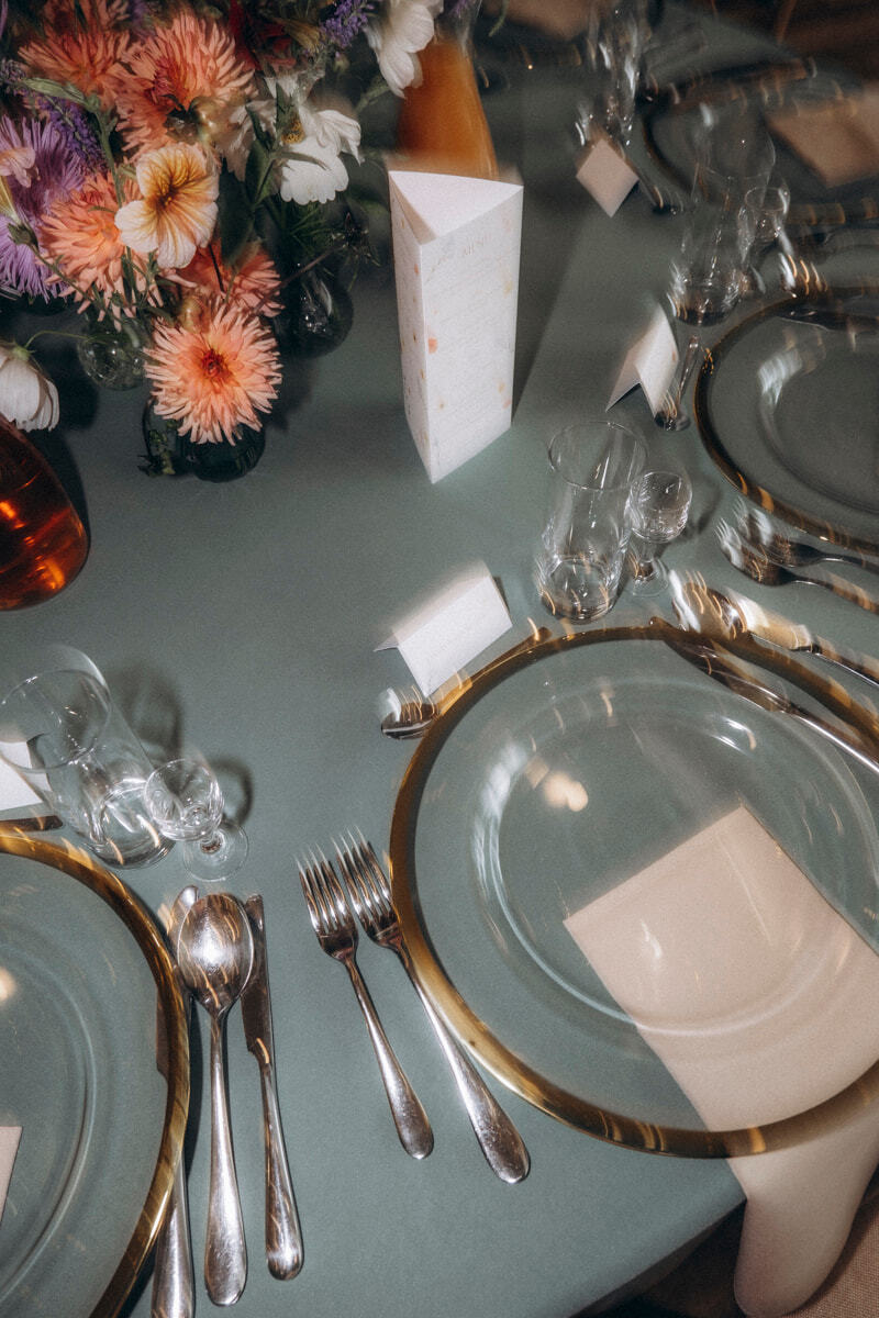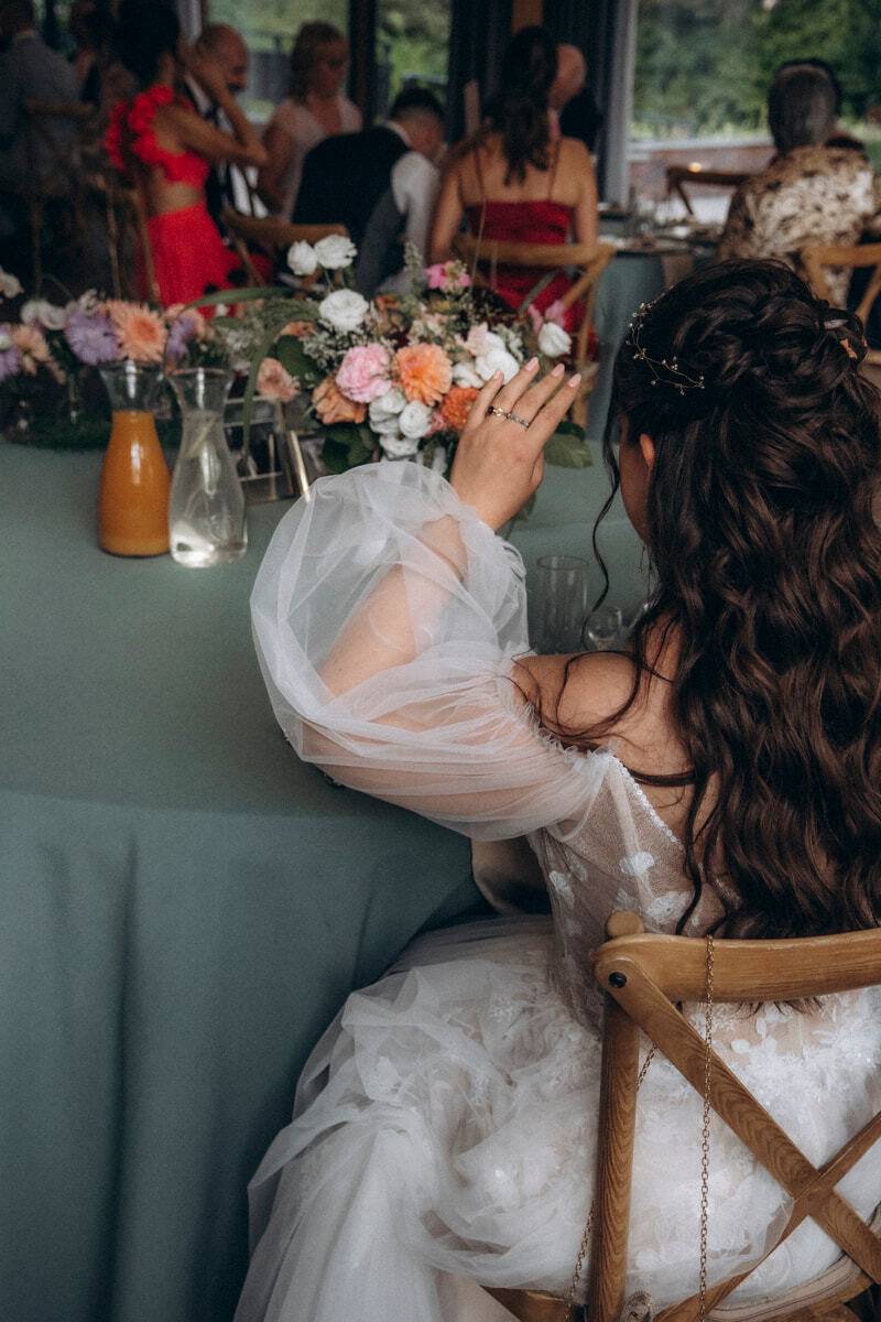 Dla Oli i Jakuba wypożyczyłam drewniane krzesła boho, które przyjechały aż z okolic Krakowa :) Do tego kremowe serwety i szałwiowe obrusy. Na stołach stanęły kompozycje z sezonowych, sierpniowych kwiatów w odcieniach różu, bieli, żółci, pomarańczu i bordo. Całości dopełniły szklane podtalerze ze złotymi rantami. Za stołem Pary Młodej stanęła piękna pergola kwiatowa w pastelowych odcieniach :)